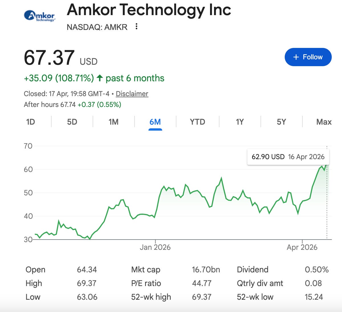 In case you missed our original write-up on Amkor Technologies (AMKR), you can find it below. It is free to read and easy to understand. Michel and I first covered the stock when it was trading at $30; it has since climbed to $69. We will be providing a fresh update shortly after their upcoming quarterly earnings report.