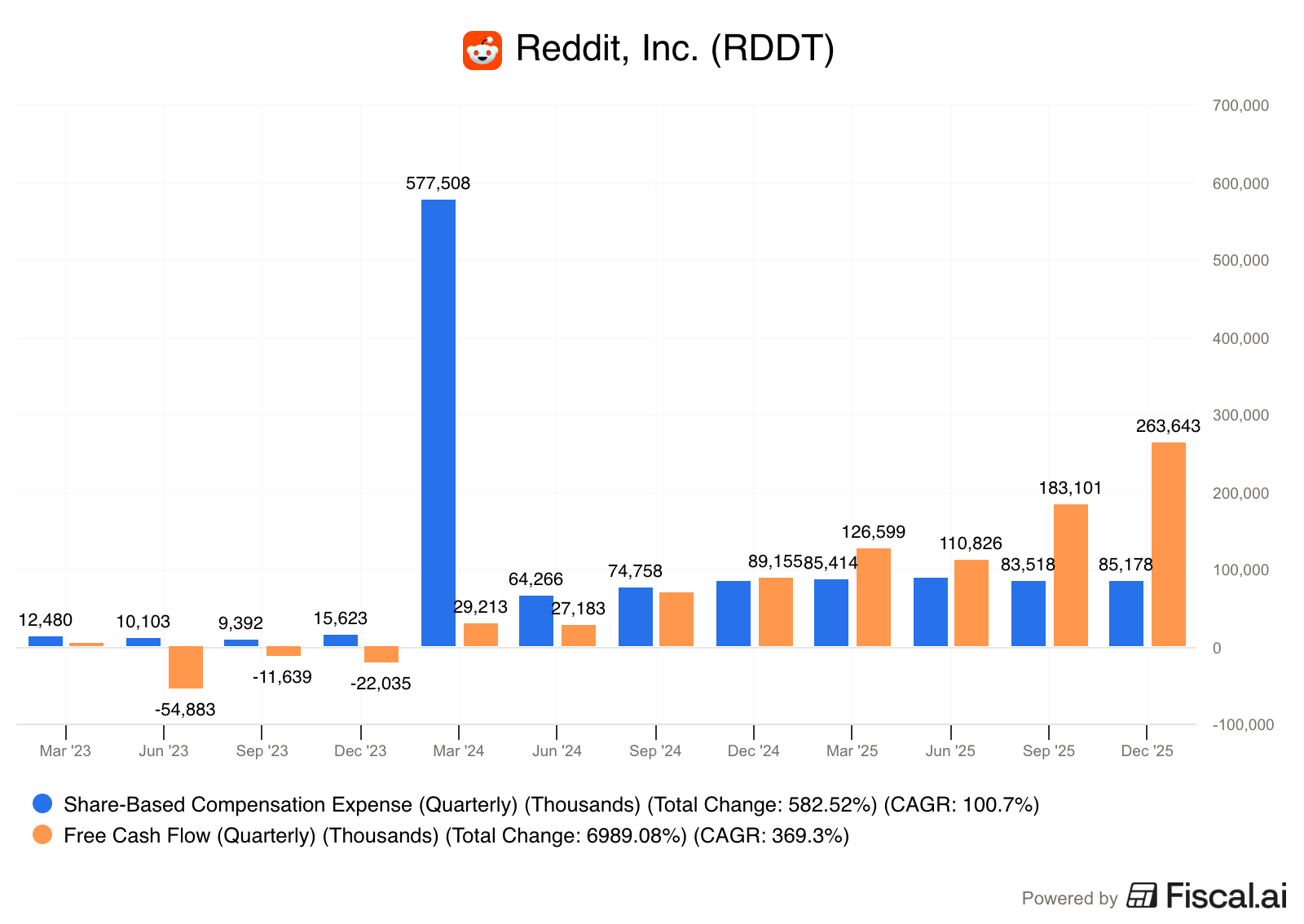 SBC: While the $1B repurchase program is a positive signal, Reddit’s heavy reliance on SBC remains a concern. In FY 2025, SBC represented ~50% of total FCF, though management has successfully reduced this burden on a quarterly basis. As shown below, the 'SBC-to-FCF' ratio is trending toward a more sustainable level: