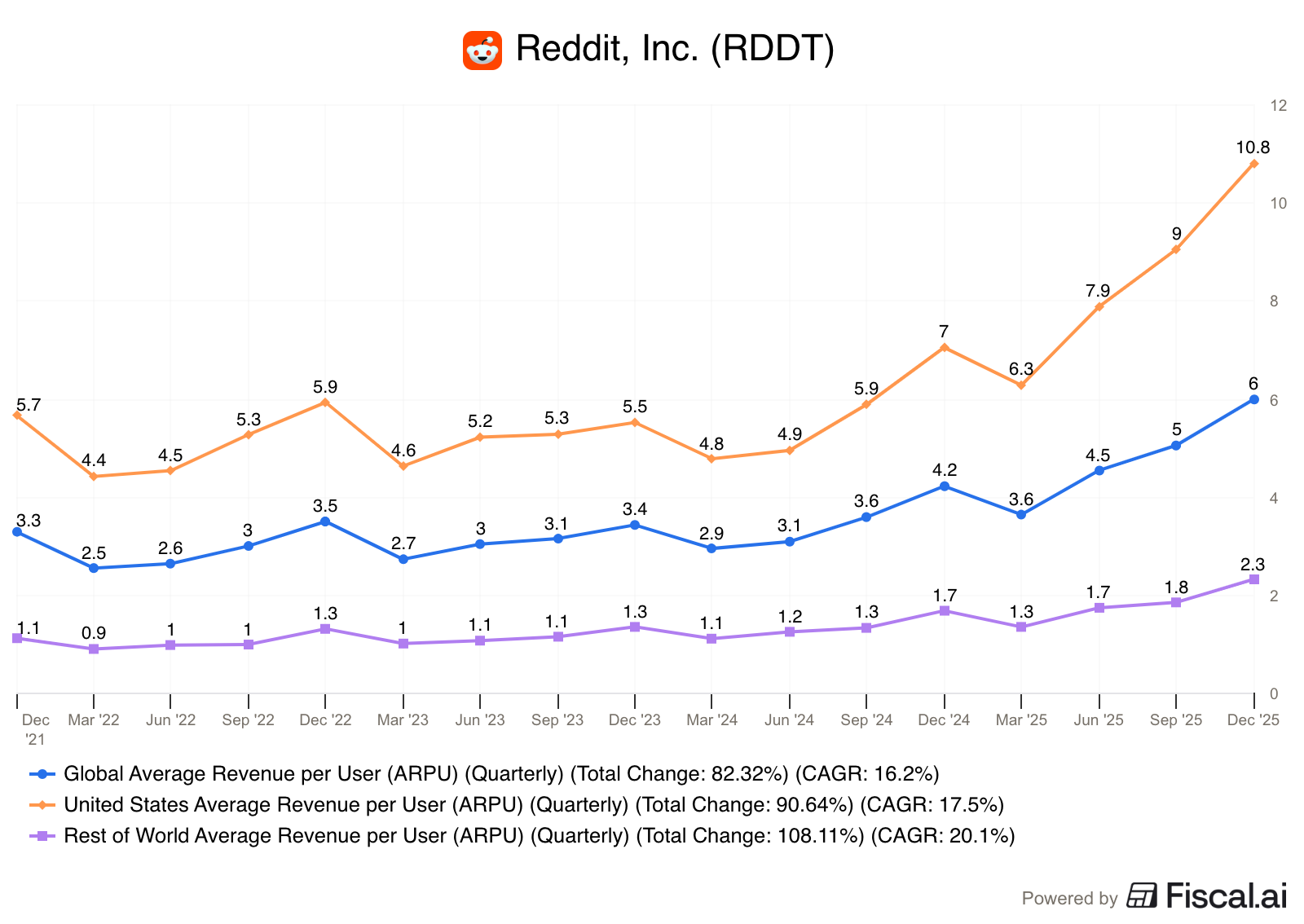 ARPU Expansion: In Q4 2025, Average Revenue Per User (ARPU) jumped 42% YoY to $5.98. There is still a massive gap between Reddit’s ARPU and Meta’s, representing a runway for growth, though matching META’s ARPU is a tough ask. The chart below shows Global ARPU and ARPU by region.