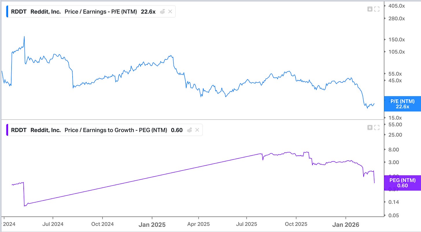 Beyond its stellar fundamentals, Reddit presents a highly attractive valuation profile relative to its growth trajectory. The stock currently trades at 22x forward earnings, despite an expected 29% top-line CAGR over the next five years. With operating margins projected to climb above 40% and DAUs estimated to double, the risk-reward setup is compelling.
