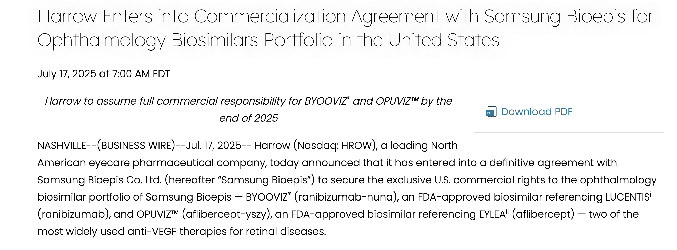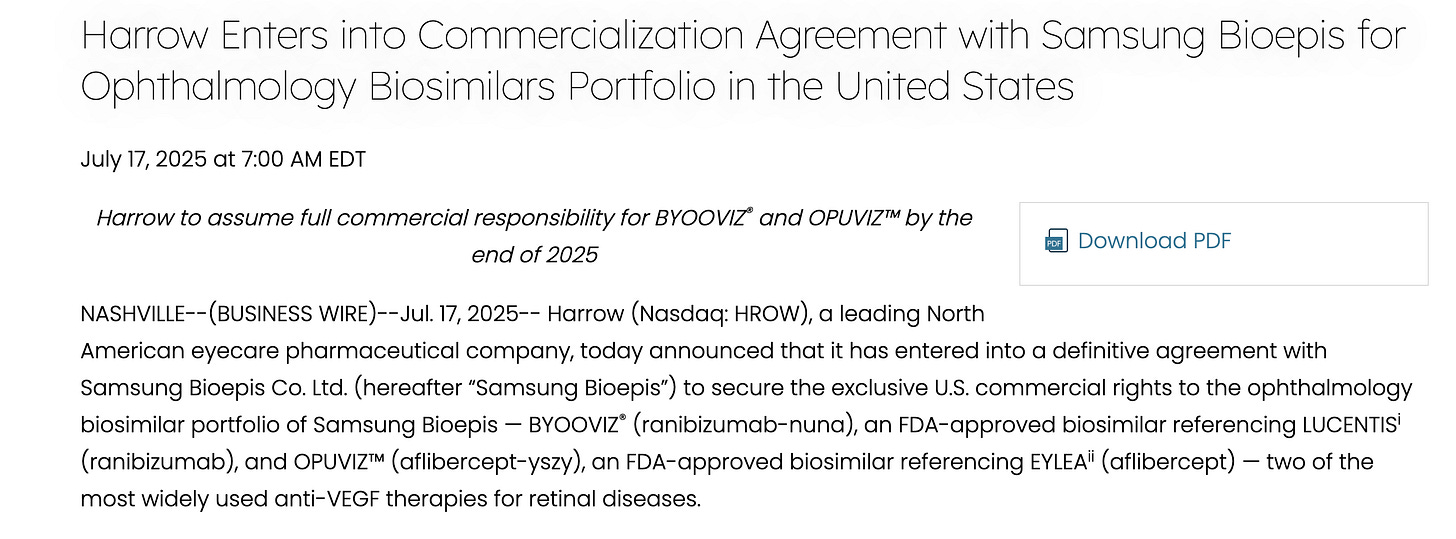 Furthermore, as recently as July 17th, Harrow entered into a commercialisation agreement with Samsung Bioepis for Ophthalmology Biosimilars Portfolio in the United States i.e. BYOOVIZ and OPUVIZ. These are anti-VEGF therapies for conditions such as Age-related macular degeneration, Diabetic Macular Oedema and Retinal Vein Occlusion.