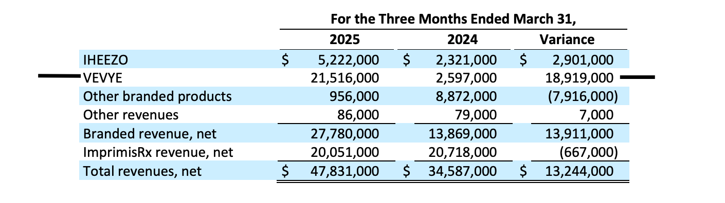 Beyond VEVYE, the company has several other revenue-generating branded products (see earlier table). Whilst net revenues from this portfolio were softer in Q1, we should expect revenues from these products to steadily contribute more to Harrow’s overall revenue. This diversified portfolio mitigates reliance on a single drug or indication. The pass-through reimbursement status for TRIESENCE , which became effective on April 1st 2025, is expected to boost its adoption meaningfully. On the call they also reiterated their confidence in growing unit demand for IHEEZO through the remainder of the year.