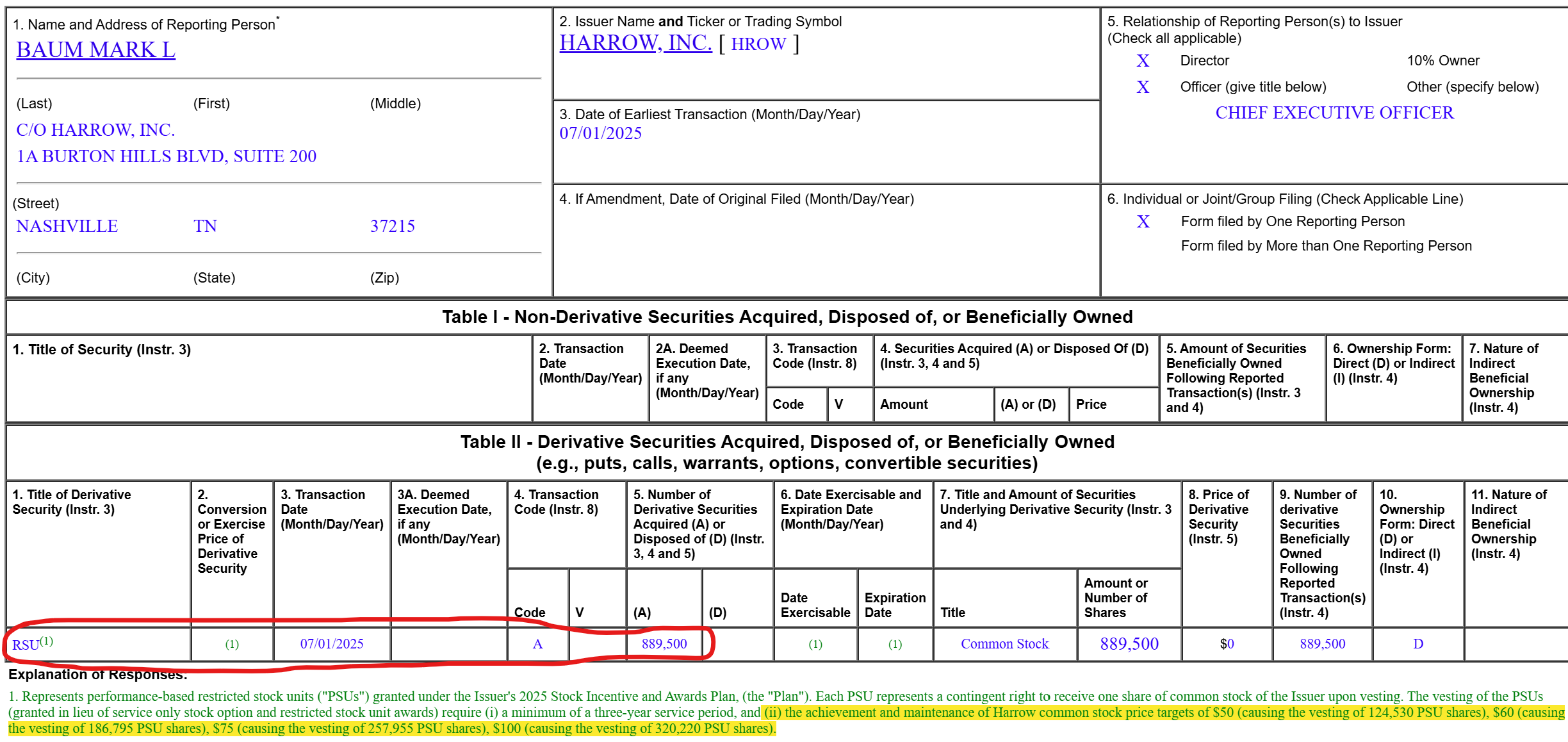 There is a very interesting incentive structure whereby CEO Mark Baum will receive approximately 890k shares (~3% of company, ~$90m pretax) if stock touches $100 but gets zero if stock does not hit $50. Likewise, the CFO gets paid big, approximately $40m of stock if HROW hits $100. This “bet big on yourself” deal is certainly interesting given the stock is currently ~$32.