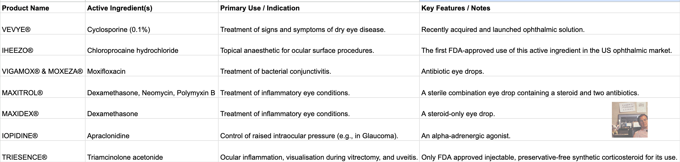 Harrow's commercial portfolio includes a range of branded products designed to address several eye conditions. This table below neatly presents them by product name, active ingredient and indication.