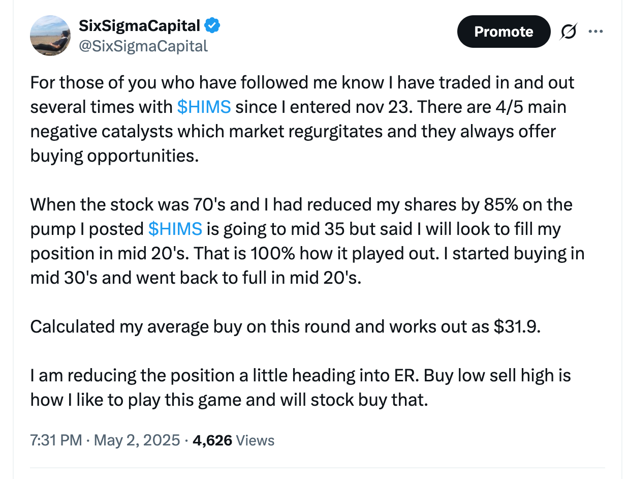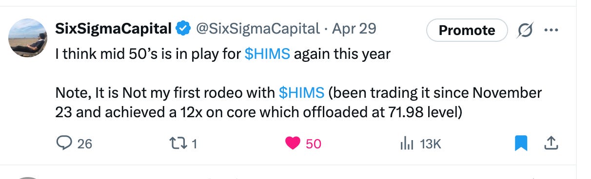 I have been involved in HIMS since late 2023 from $6 rode it up to 70’s reducing 85% of shares in late 50’s to 71.98 and have done some judicious trading in between to juice my gains. When stock was in 70’s called for it to reach mid 30’s minimum and likely mid 20’s. I still own my shares from cost basis of $6. I have accumulated shares since then at $31.9 and recently off-loaded some of these mid 50’s to 64 level. Stock is now currently again in the mid 50’s.
