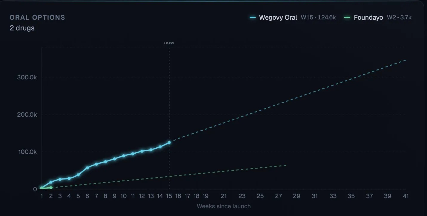 Wegovy Pill: Significantly outpaced Foundayo, jumping from 3,071 in its first four days to , 18,410 by its second week.