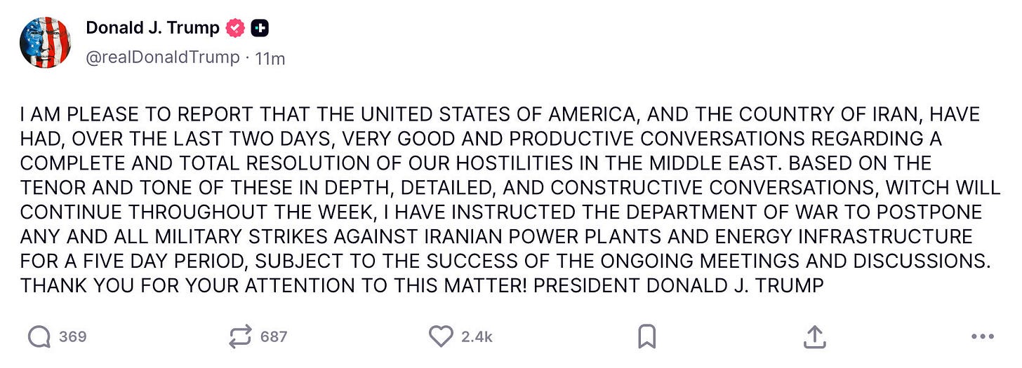 “The United States and Iran have had productive discussions over the past two days toward fully resolving hostilities in the Middle East. As talks continue this week, I’ve ordered a five-day pause on any military strikes against Iranian energy infrastructure, contingent on progress. Thank you. —President Donald J. Trump”