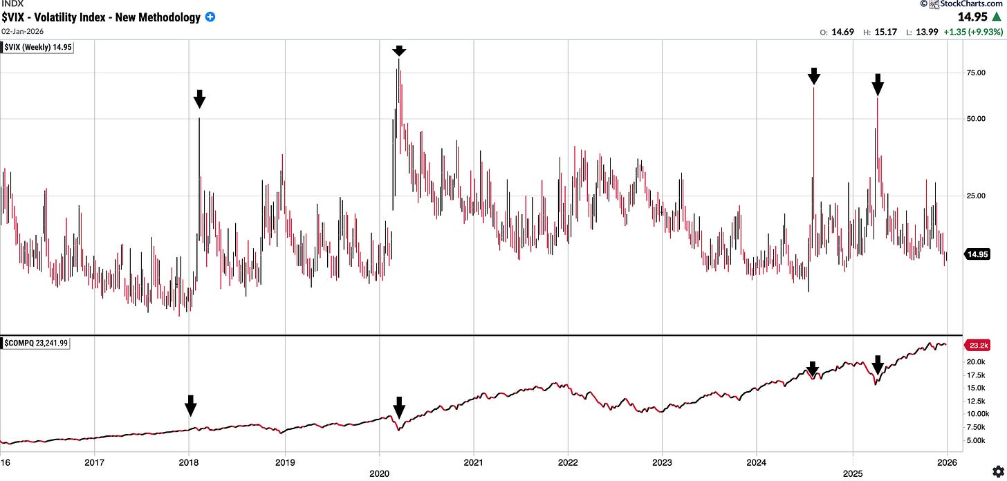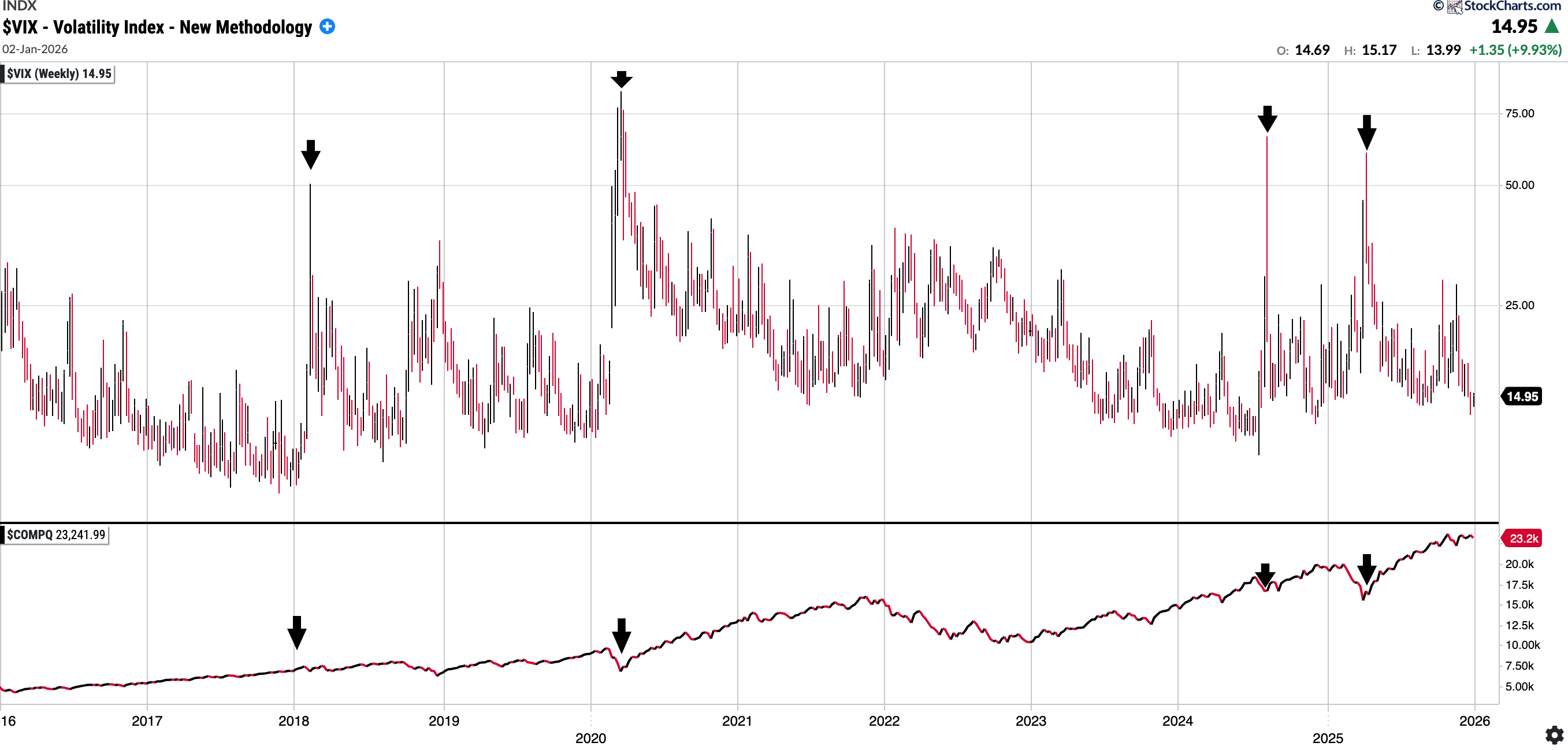 VIX: 14.95. That is in the lower range of where we have been in the last 12M. I have included a chart below showing the VIX over time and Nasdaq Comp underneath it: you can see extreme readings always have been a buying opportunity in medium term.