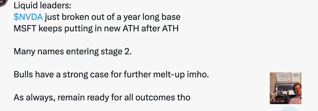 Indices have now breached new ATHs, and as I posted recently, liquid leaders such as NVDA and MSFT are breaking out and making new ATH’s. This is not bearish.