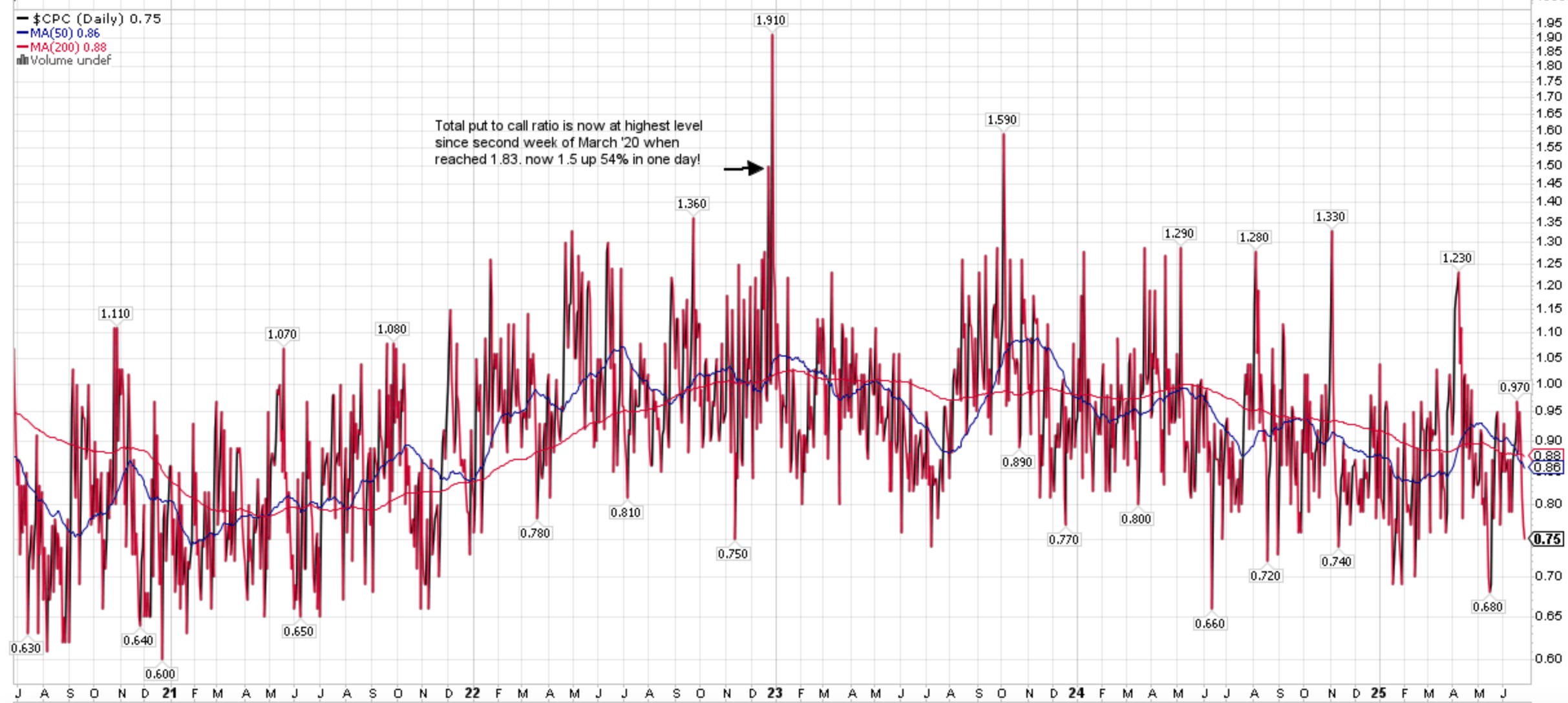 CPC (Put to Call Ratio) is subdued at 0.75. >1 usually indicates Fear and >1.5 can be Extreme.
