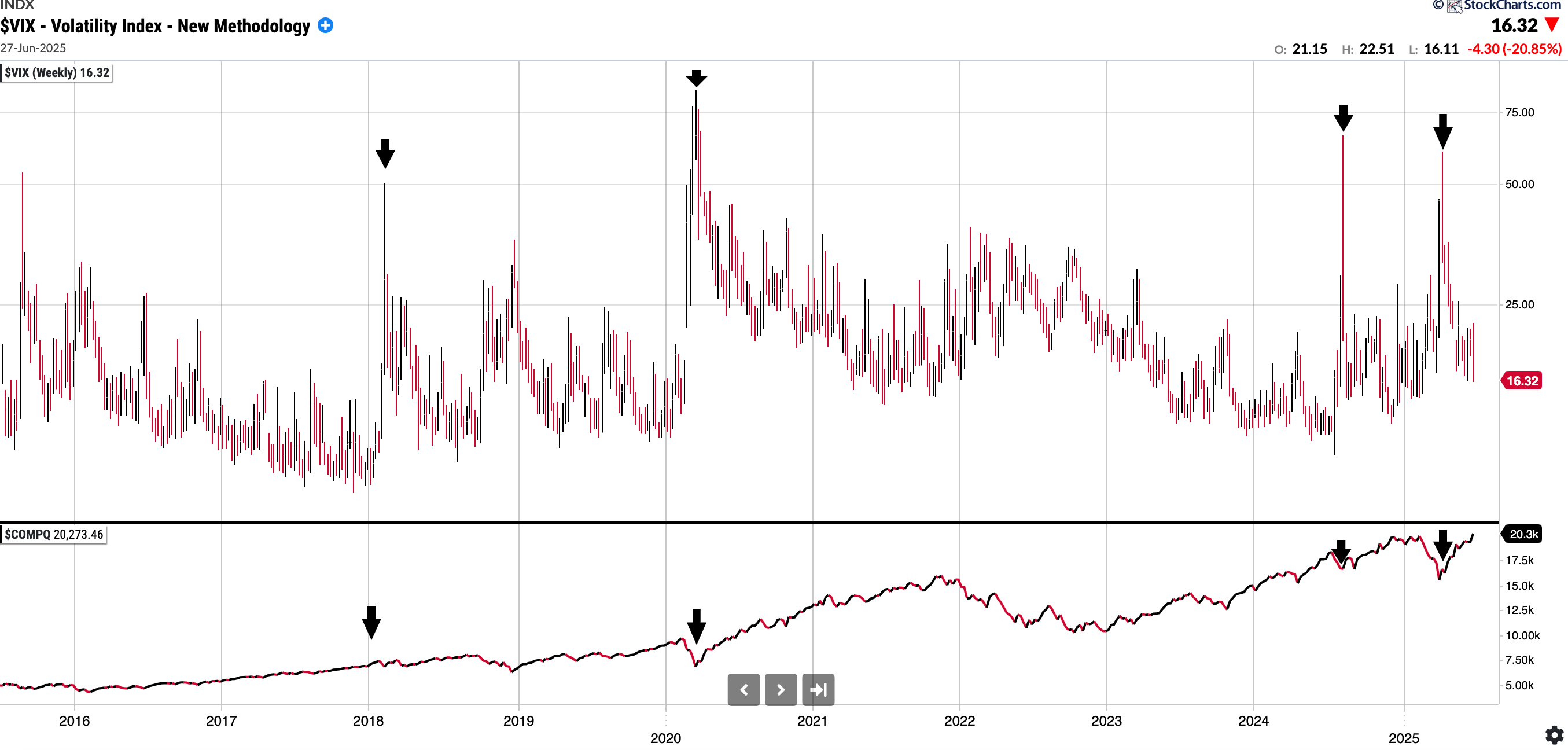 Vix: Is 16.32. That is in the lower range of where we have been in the last 6M. Note that in April we did get a >60 print. I have included a chart below showing the Vix over time and Nasdaq Comp underneath it: you can see extreme readings always have been a buying opportunity in medium term.