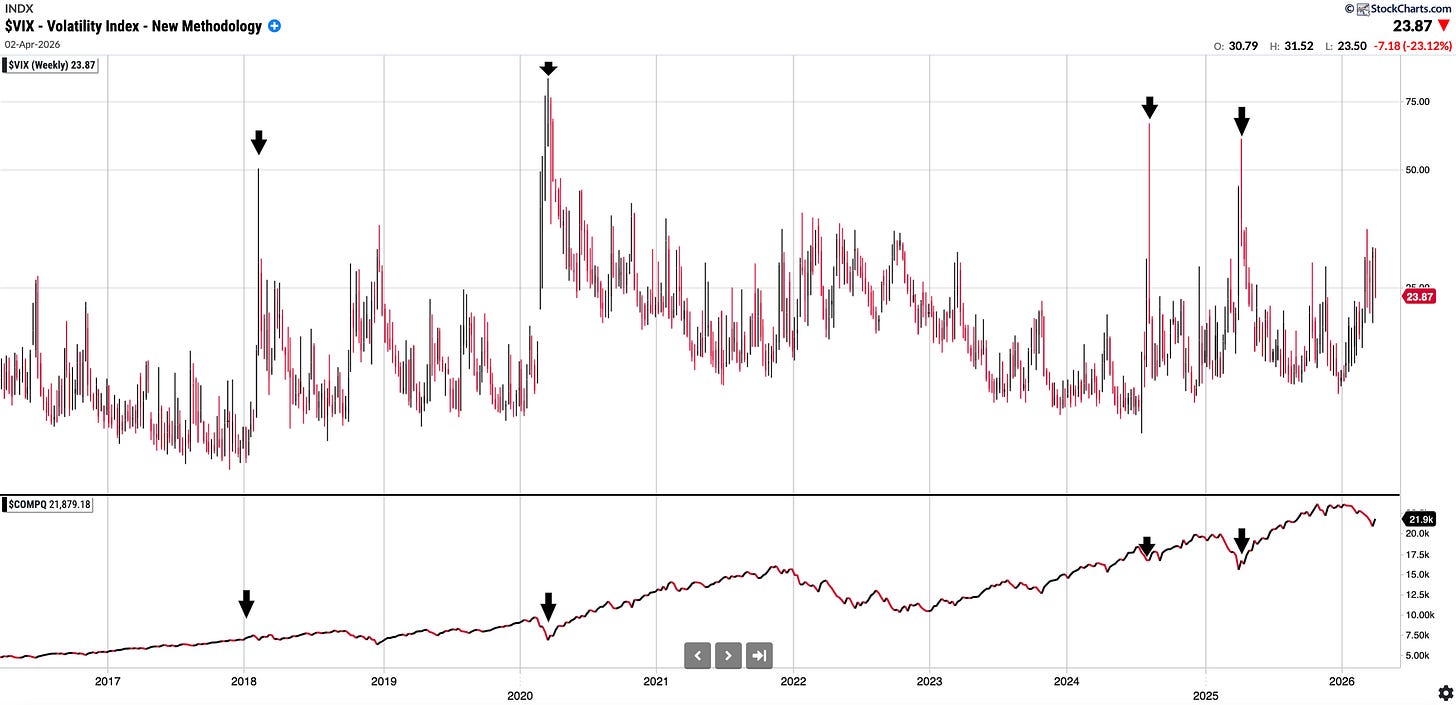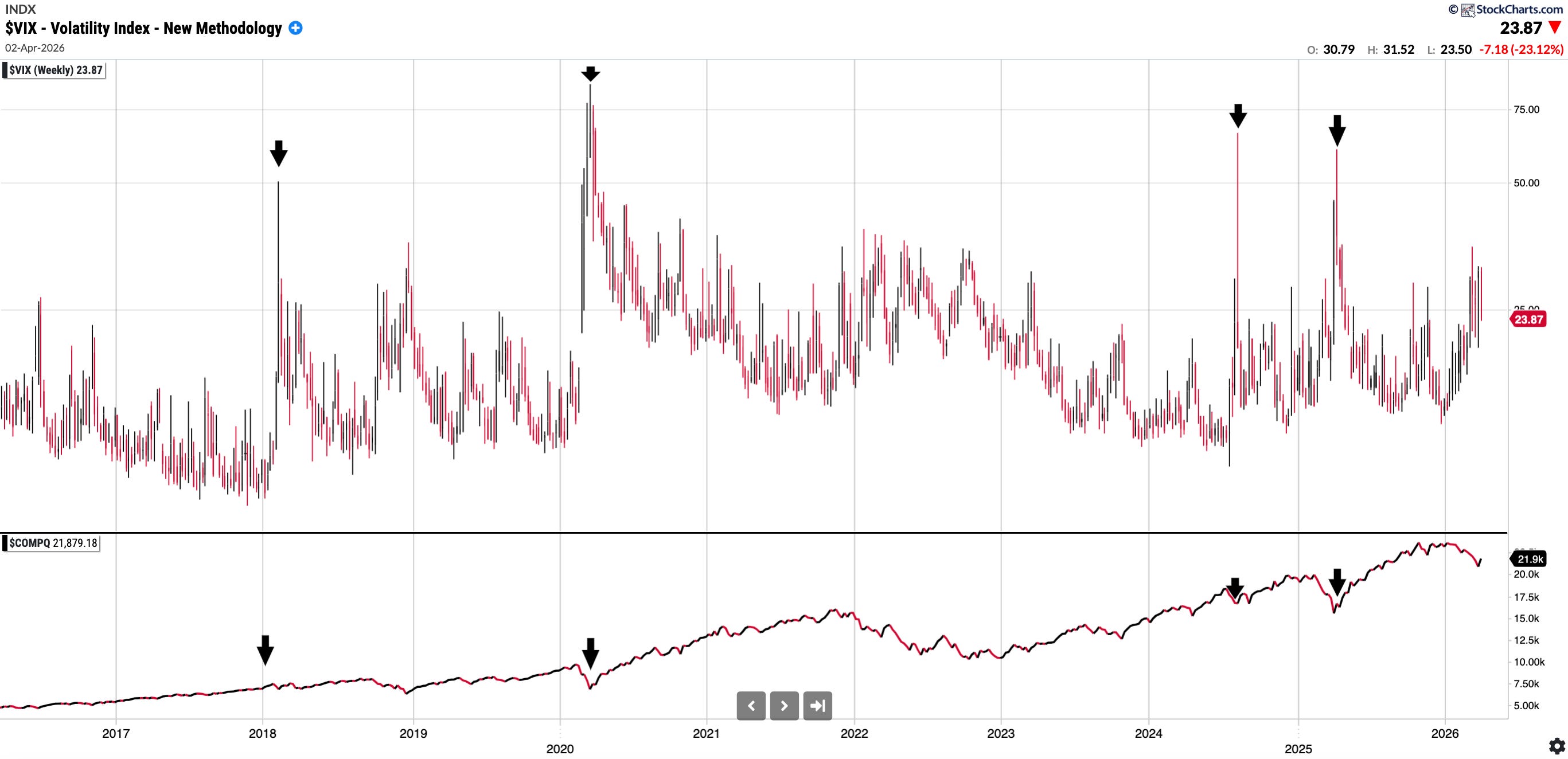 VIX: 23.87. Has remained above 20 mark thus far YTD. I have included a chart below showing the VIX over time and Nasdaq Comp underneath it: you can see extreme readings always have been a buying opportunity in the medium term.
