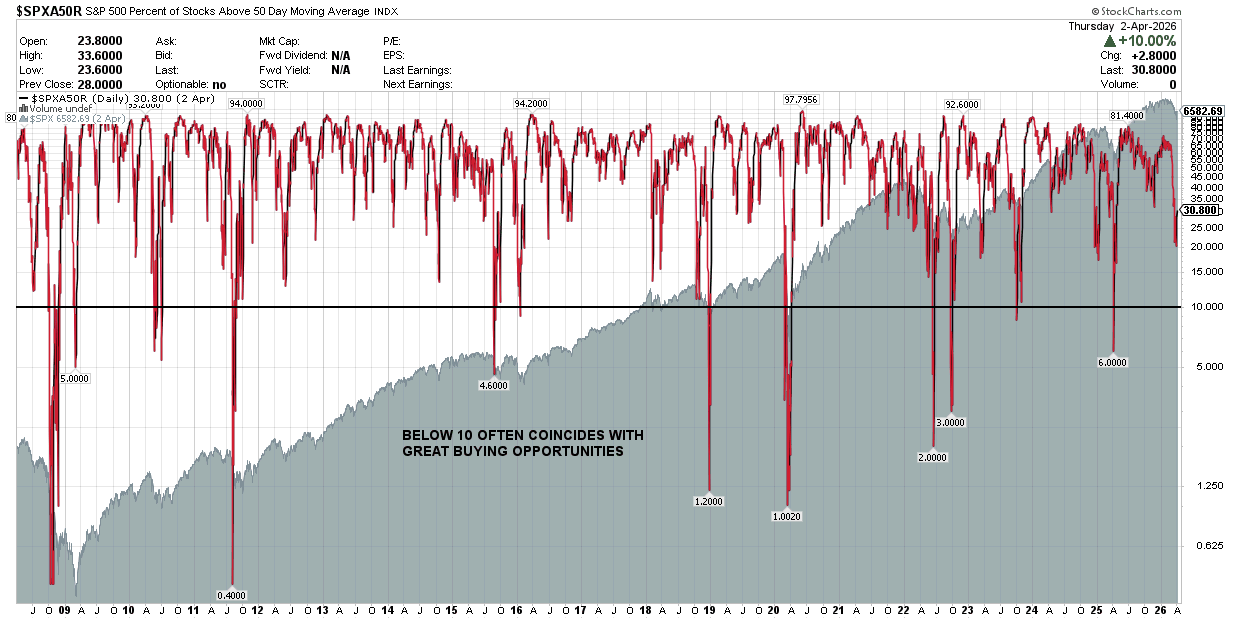 S&P 500 Percentage of Stocks Above the 50 Day Moving Average: 30.8% (<10 tend to be great buying opportunities)