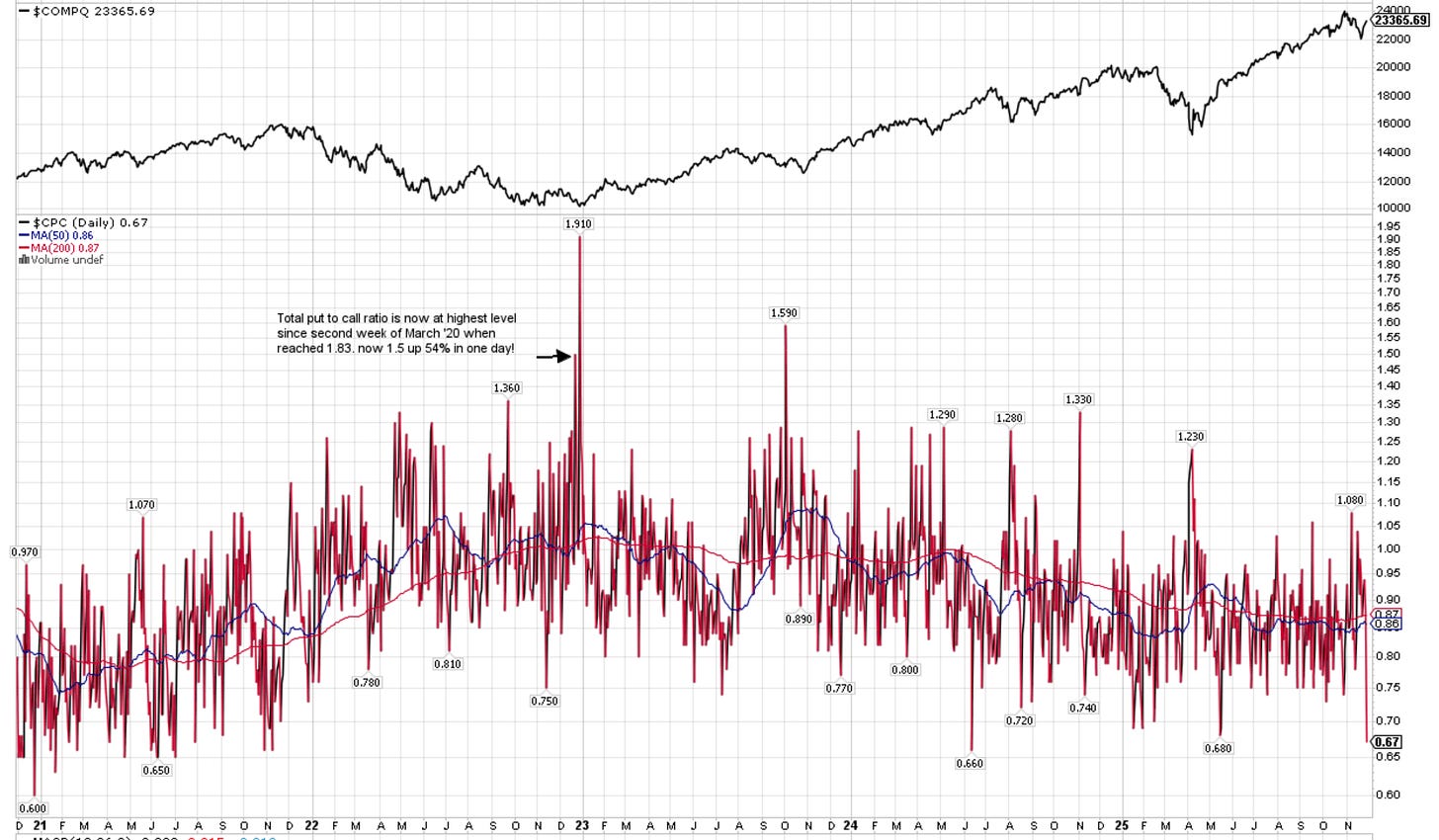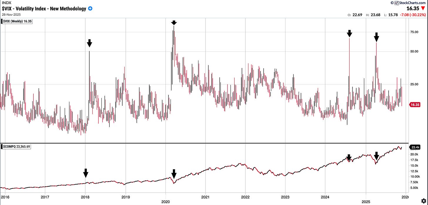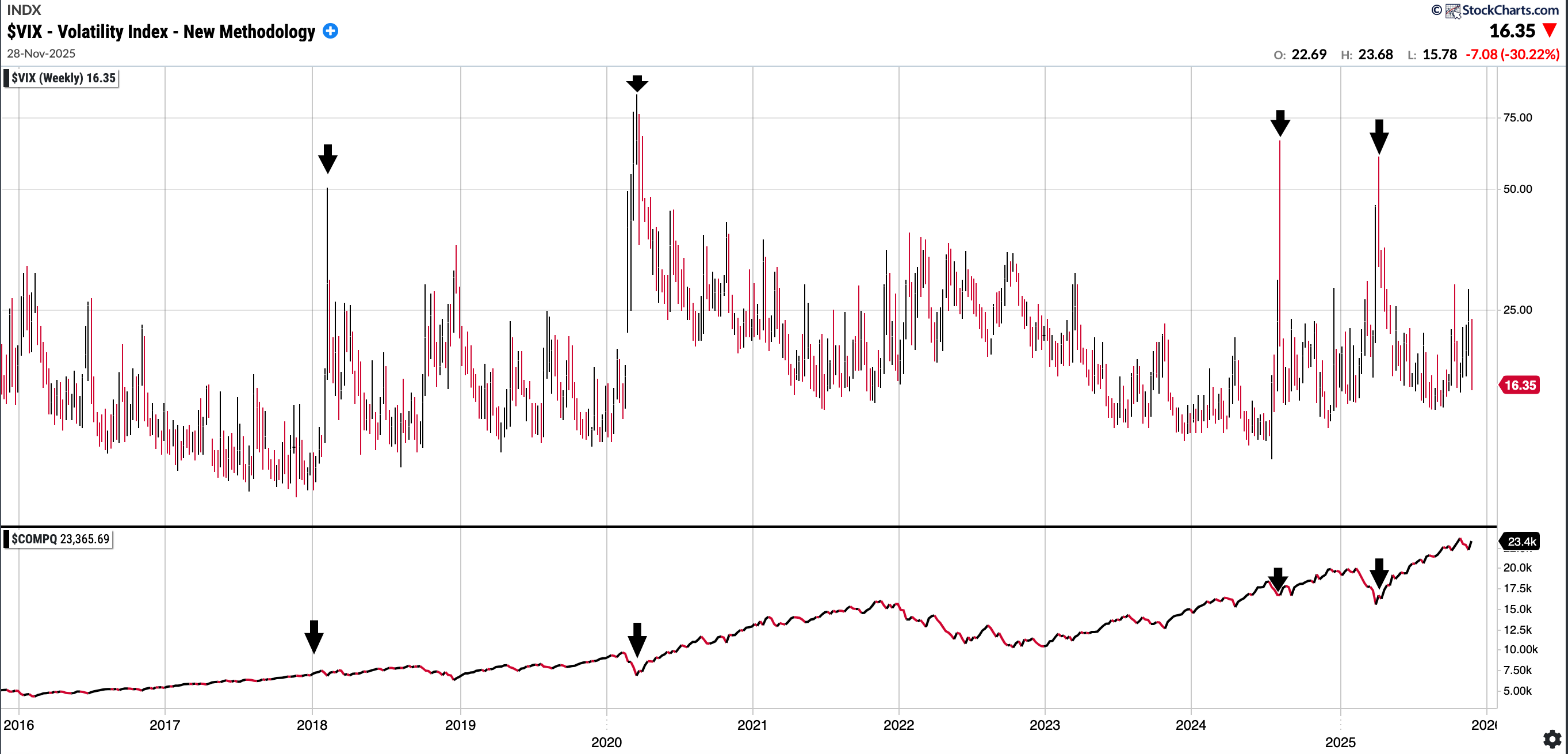 VIX: 16.35. That is in the lower range of where we have been in the last 6M. In November alone we spent the majority of it with a VIX >20 although it did decline 27.33% just this week. I have included a chart below showing the VIX over time and Nasdaq Comp underneath it: you can see extreme readings always have been a buying opportunity in medium term.