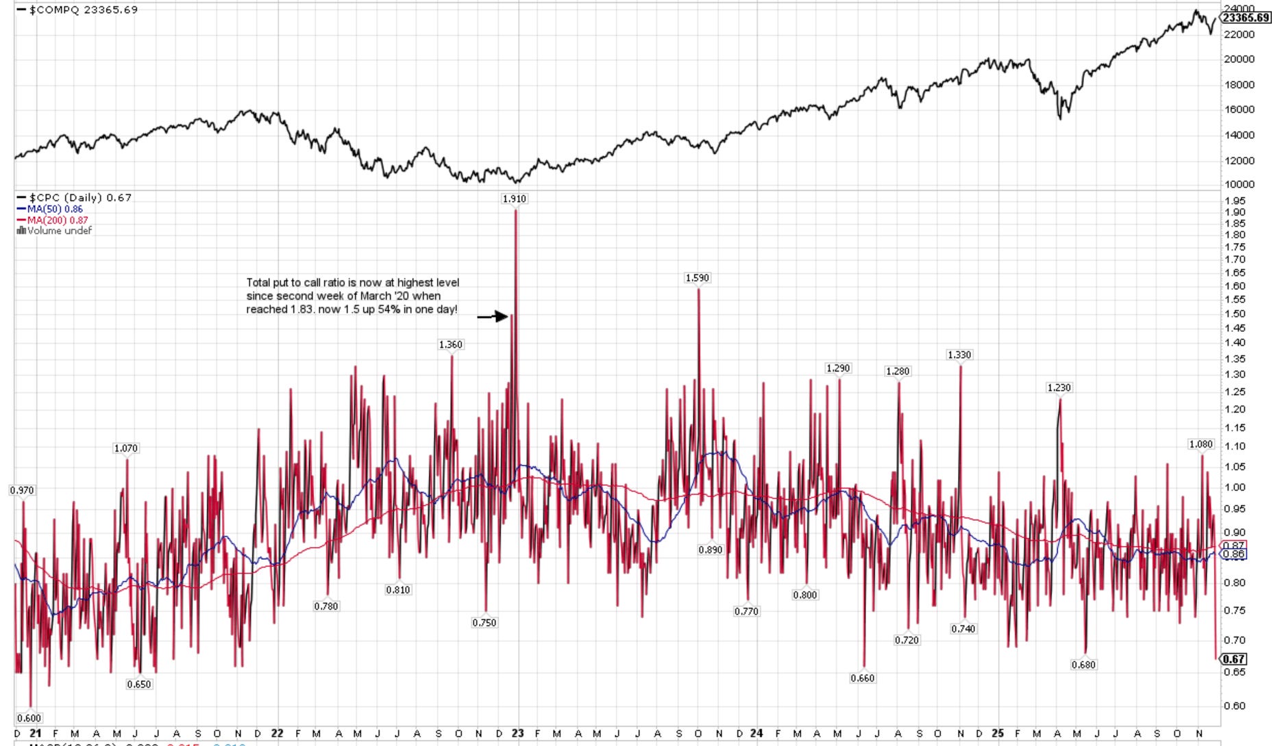 CPC (Put to Call Ratio) is subdued at 0.67. >1 can indicate Fear and >1.5 can be Extreme.
