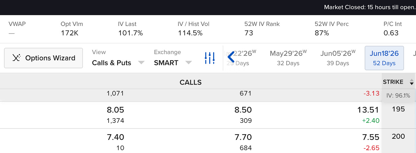 The June 18 $200 strikes are now trading at $7.55 (down roughly 30%) and will likely trade even lower tomorrow if NBIS remains flat or trends downward.