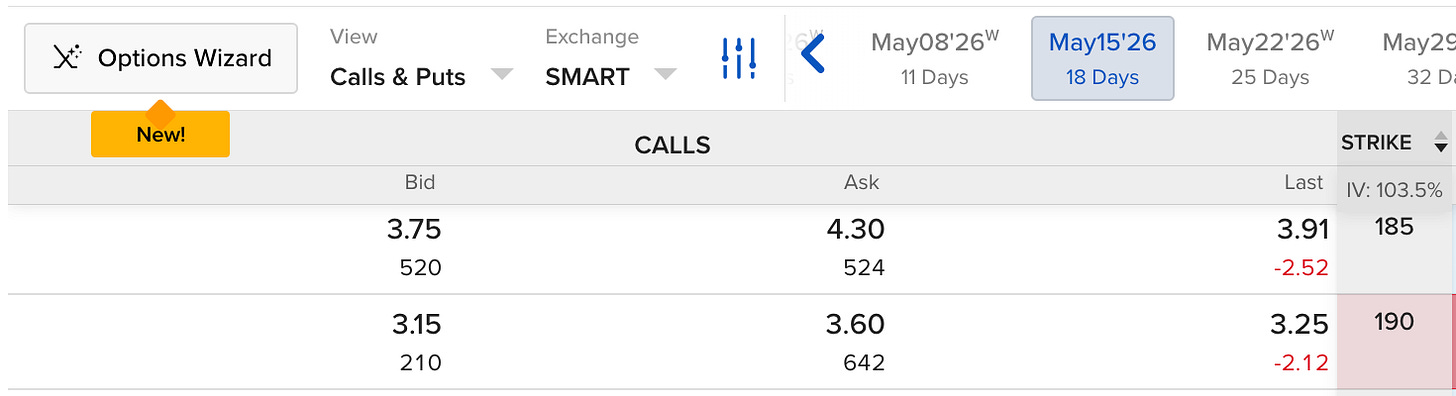 Meanwhile, the May 15 $190 strikes are trading at $3.25, a decline of approximately 55%.