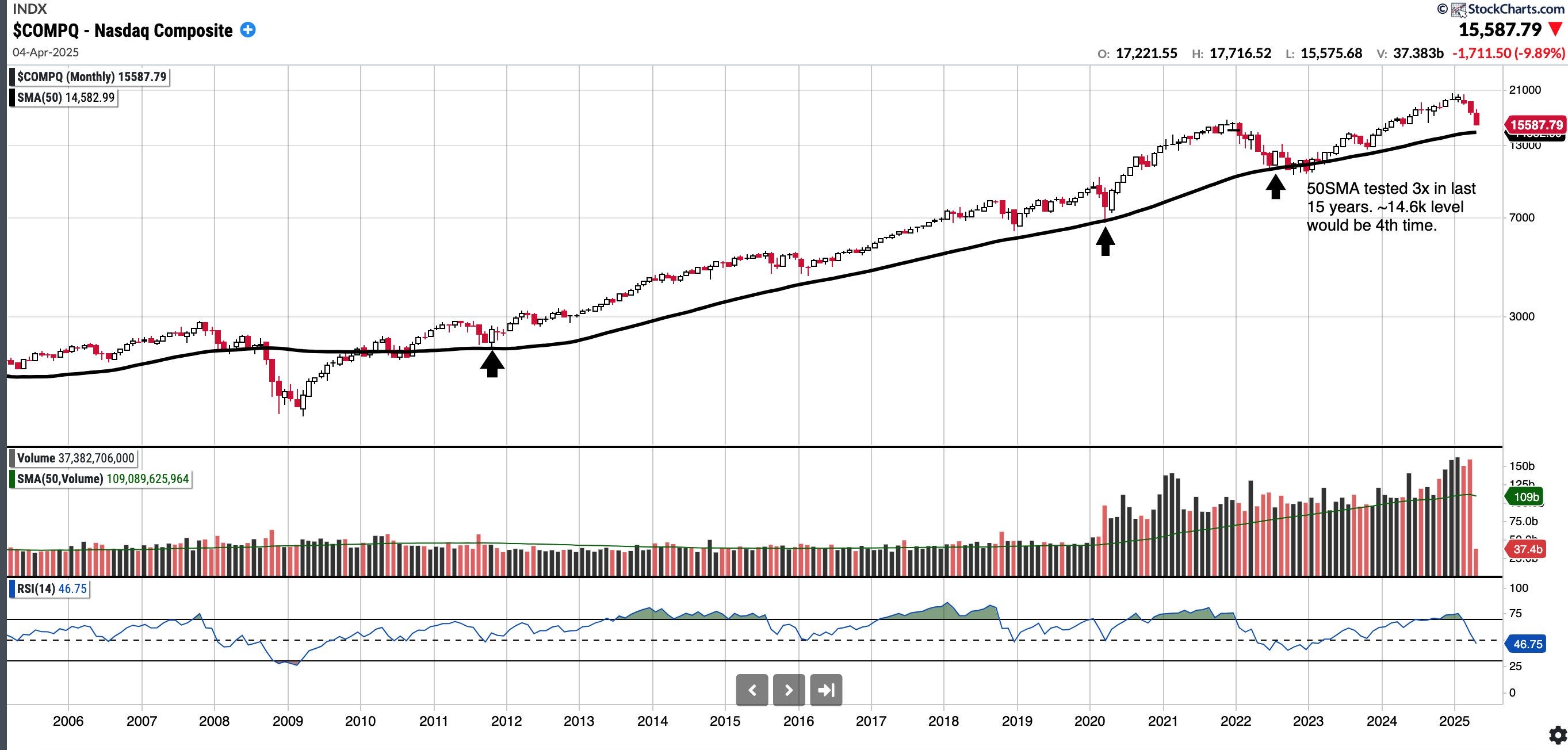 Nasdaq Composite is at 15,587. ~23% peak to trough decline. Below all key MA’s. RSI is 24.49 14.6k would be 50SMA test on the monthly, has only traded down to that level 3 times in 15 years (see chart) Trading at 27.25 trailing earnings and 23.41 forward (per WSJ)