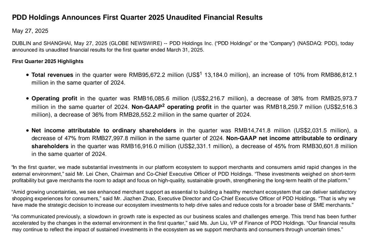 I wrote recently about PDD that it “was too cheap based on the achieved and projected growth. A re-rating is probable” However, after todays earnings where they showed a miss on top and bottom line plus worsening Margins, no re-rating is likely soon!