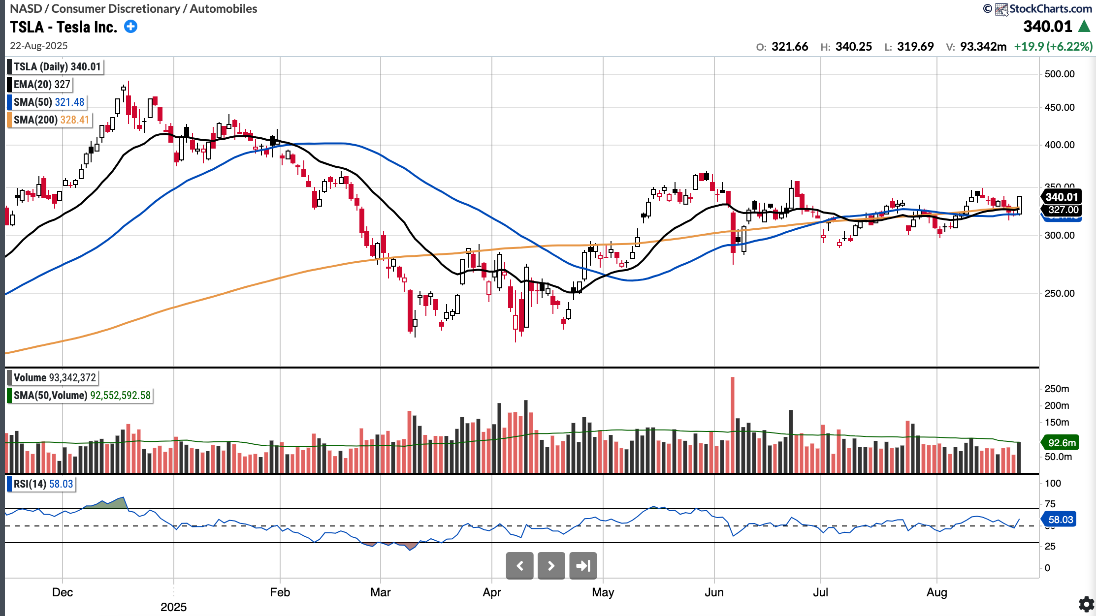 TSLA has reclaimed all its key moving averages (which are coming to a confluence now) and has shrugged off a lot of bad news in recent weeks, such as poor earnings reports, poor delivery numbers, the unimpressive launch of its Robotaxi, and, last but not least, Elon's kerfuffle with the sitting U.S. president. That is notable.