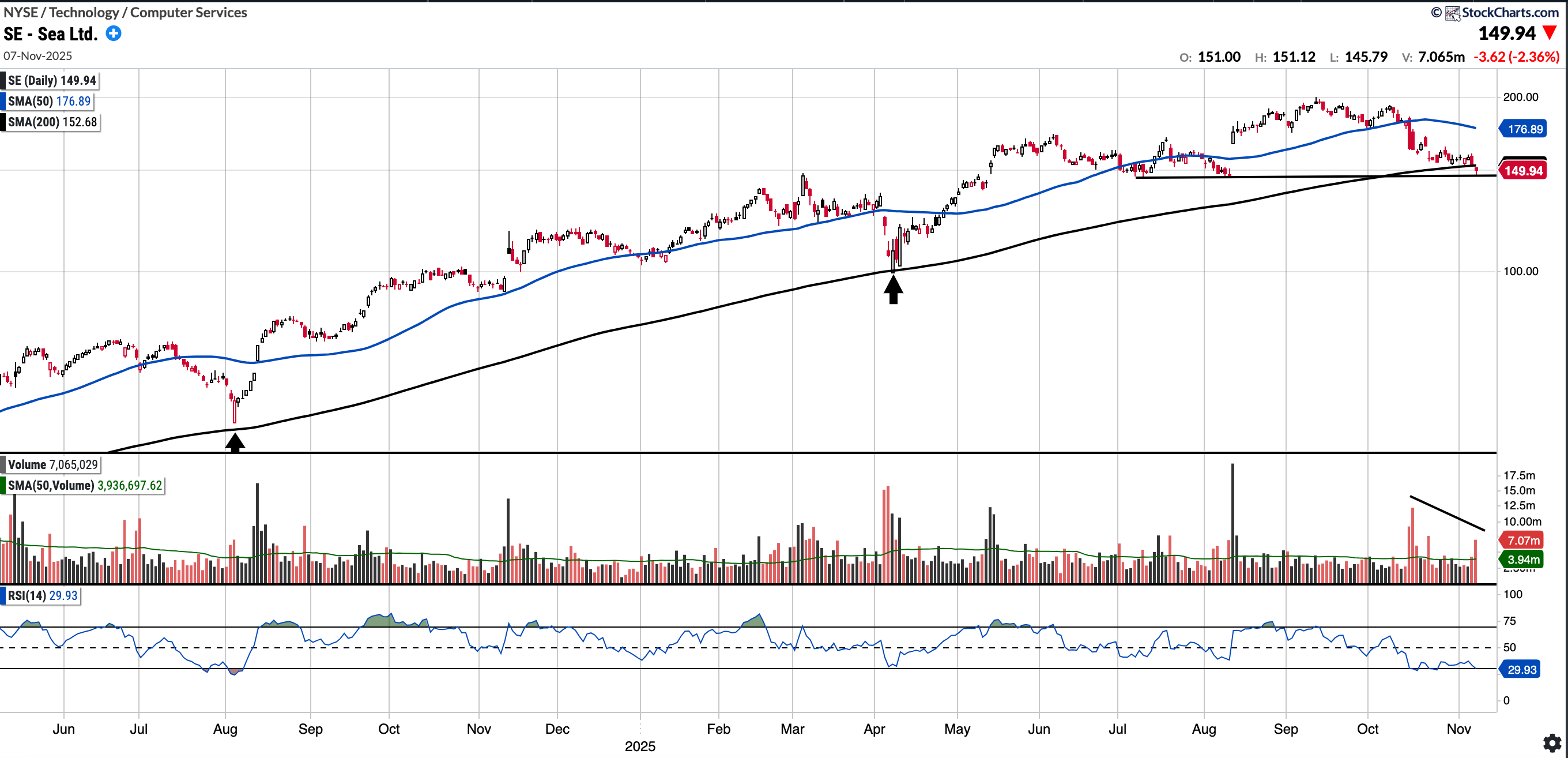 SE has had a strong couple of years and remains in an uptrend. However, it has pulled back from its recent high of $199 on almost no known news and the sell volume has been notable (see chart). Whilst we held the horizontal support at 145, it is trading below the SMA 200.