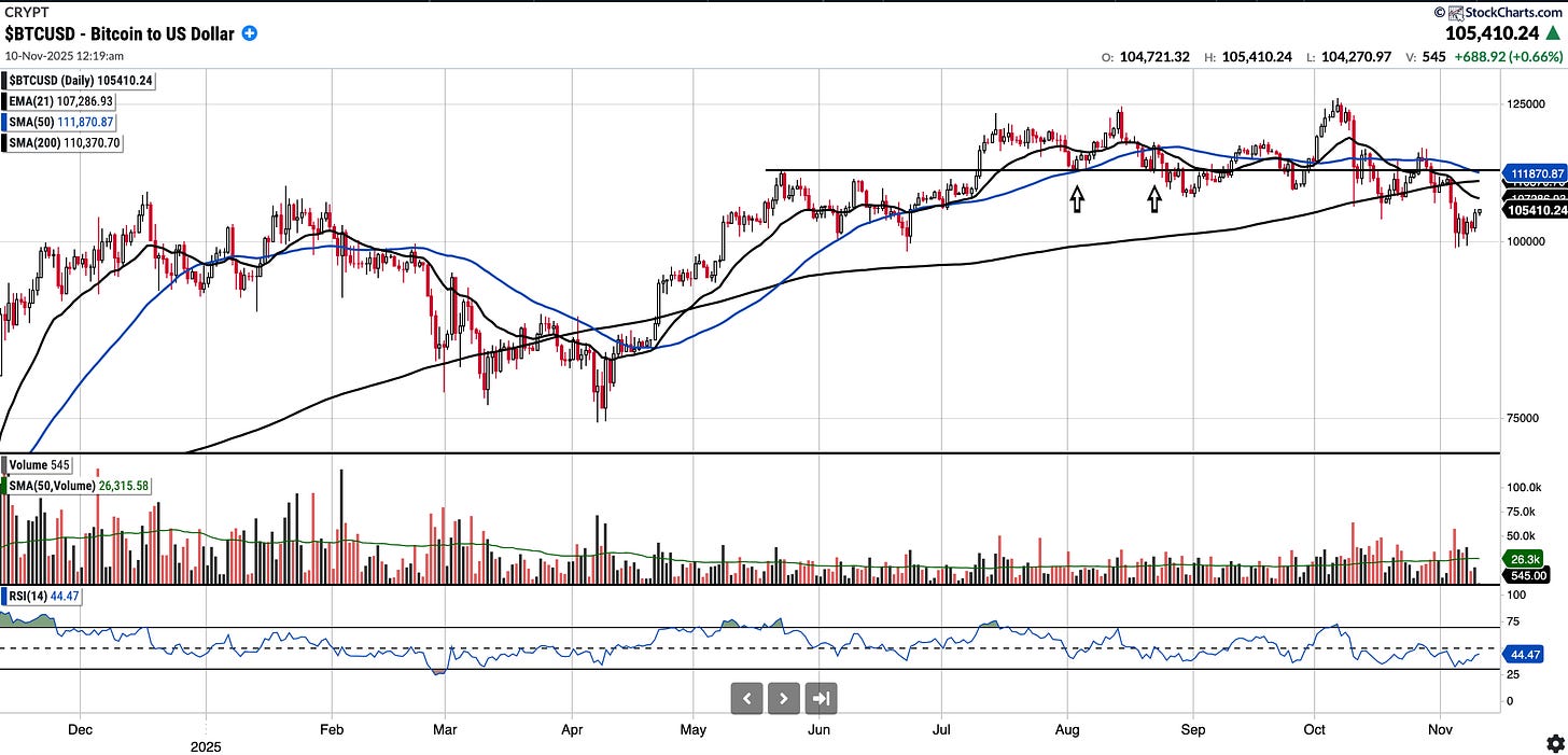 Currently trades at $105,211.73, 6.13% below the 50SMA and 4.62% below the 200SMA.