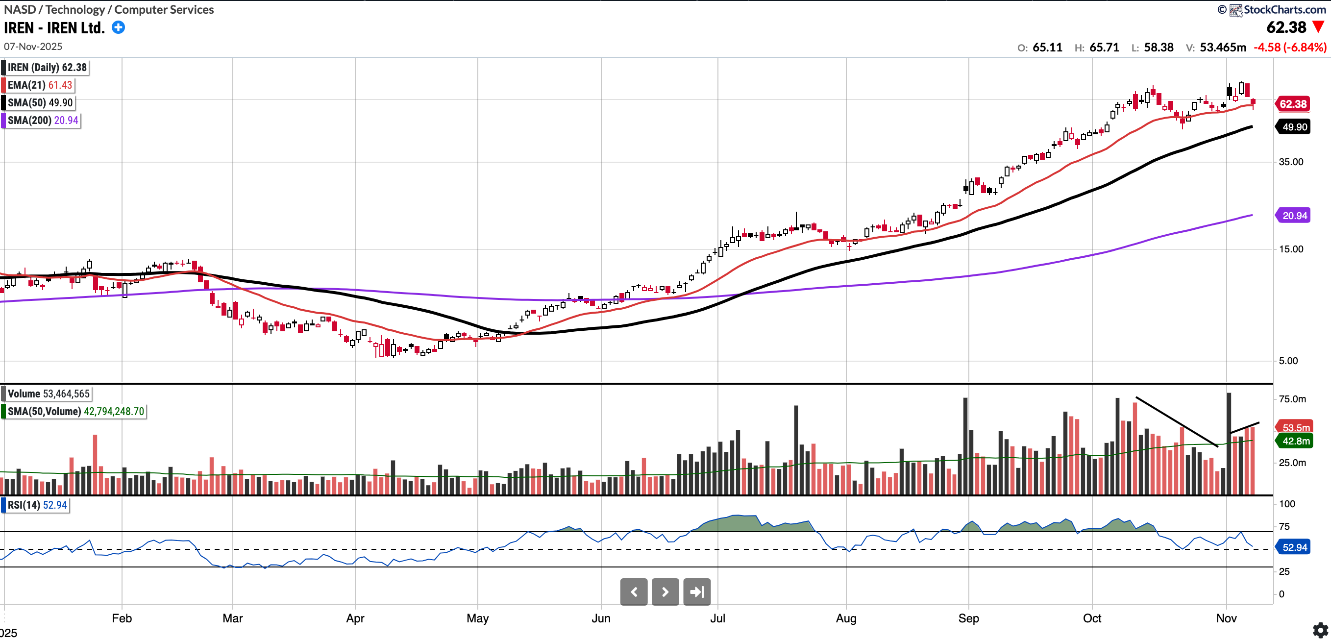 The chart remains somewhat extended still and I expect IREN will consolidate, either over time or by price. A pullback to the SMA 50 will happen at some point and may offer a better entry, this also coincides with the $49-$50 support. However, since its run in August it has mostly been respecting the EMA 21.