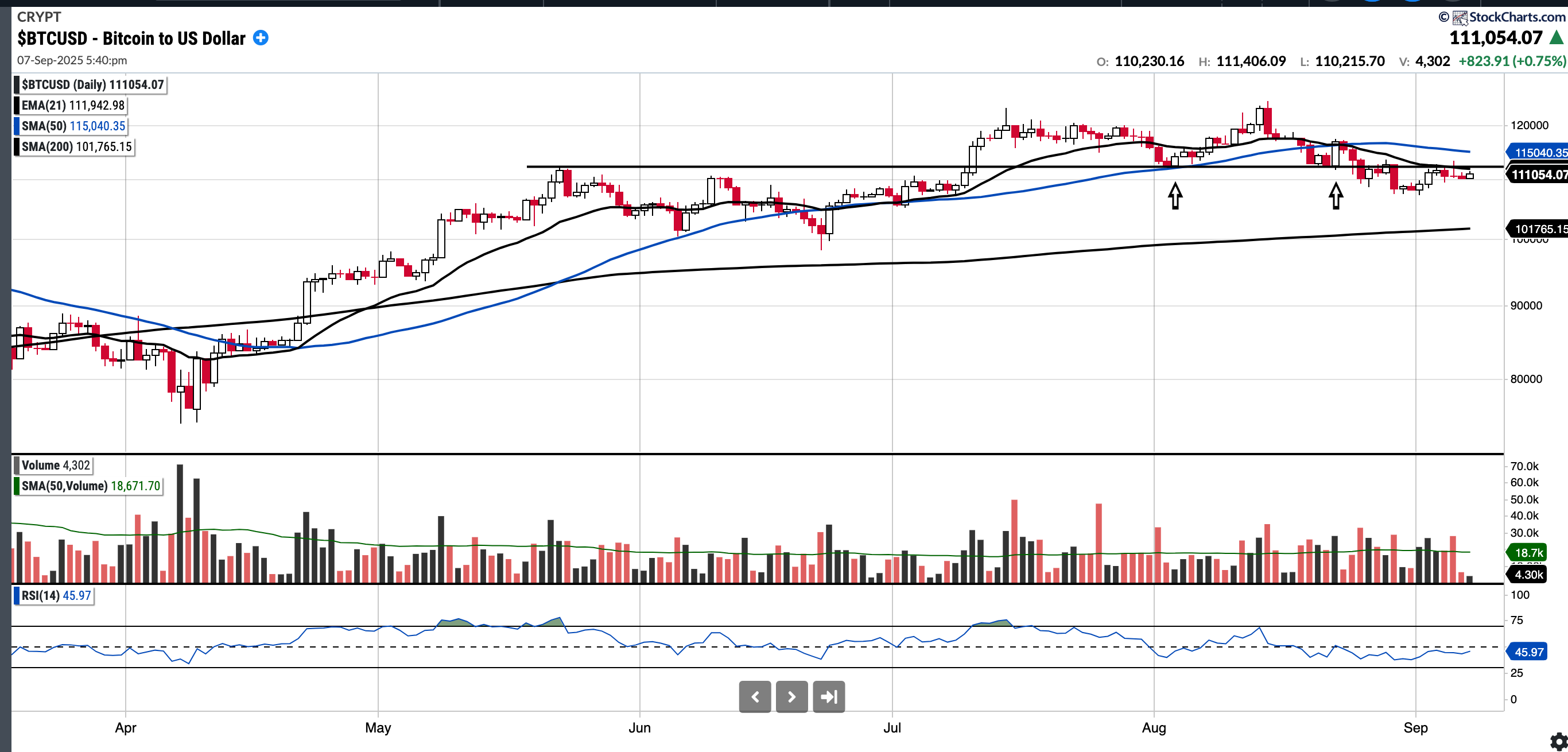 Currently $111,054.07, -3.47% below 50 SMA and 9.13% above 200SMA.