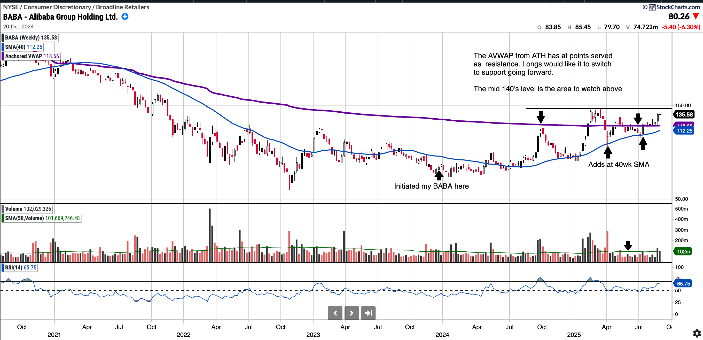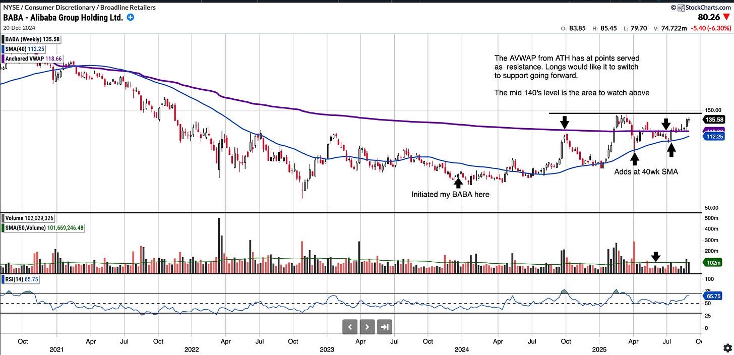 BABA had a decent run earlier in the year but found resistance in the mid 140 level where I previously reduced some of the position BABA trim March 17th 2025