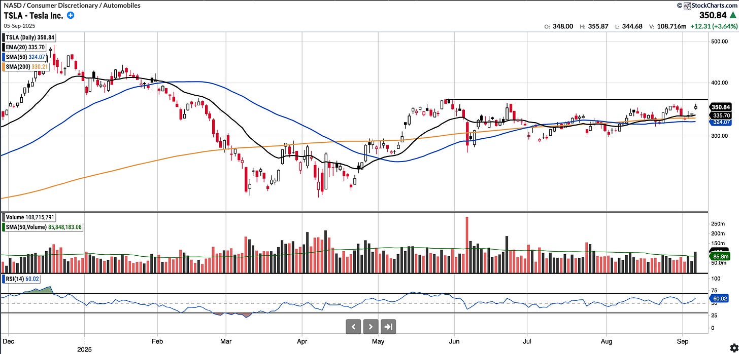 TSLA stock has been range for the last 4 months oscillating between 280 and 365 but now price action is starting to compress. Furthermore, the stock has shrugged off a lot of bad news such as poor earnings reports, poor delivery numbers, the unimpressive launch of its Robotaxi, and, last but not least, Elon's misgivings with the sitting U.S. president. That is notable.