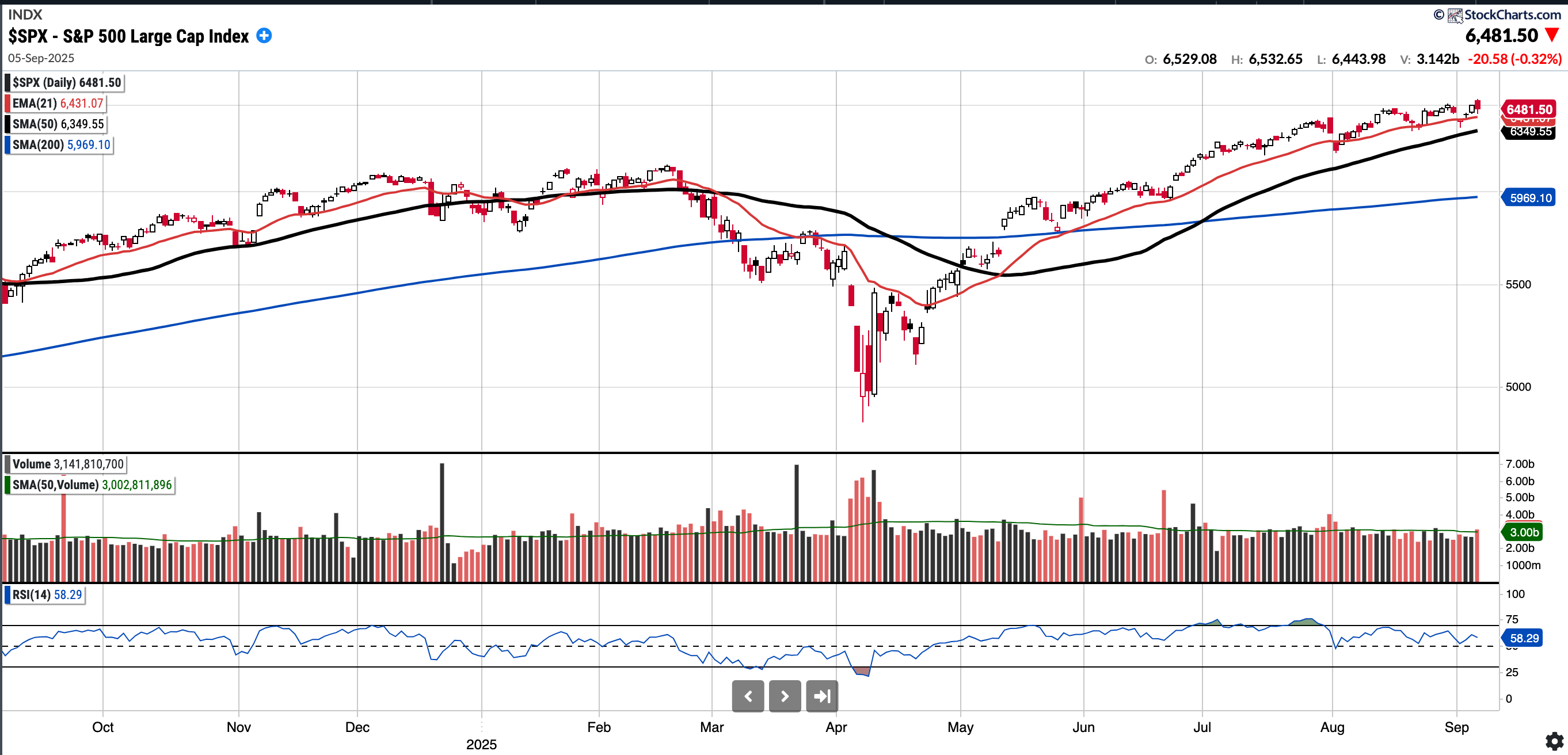 Sits currently at 6481.5, RSI 58.29, 2.08% above a rising 50SMA.