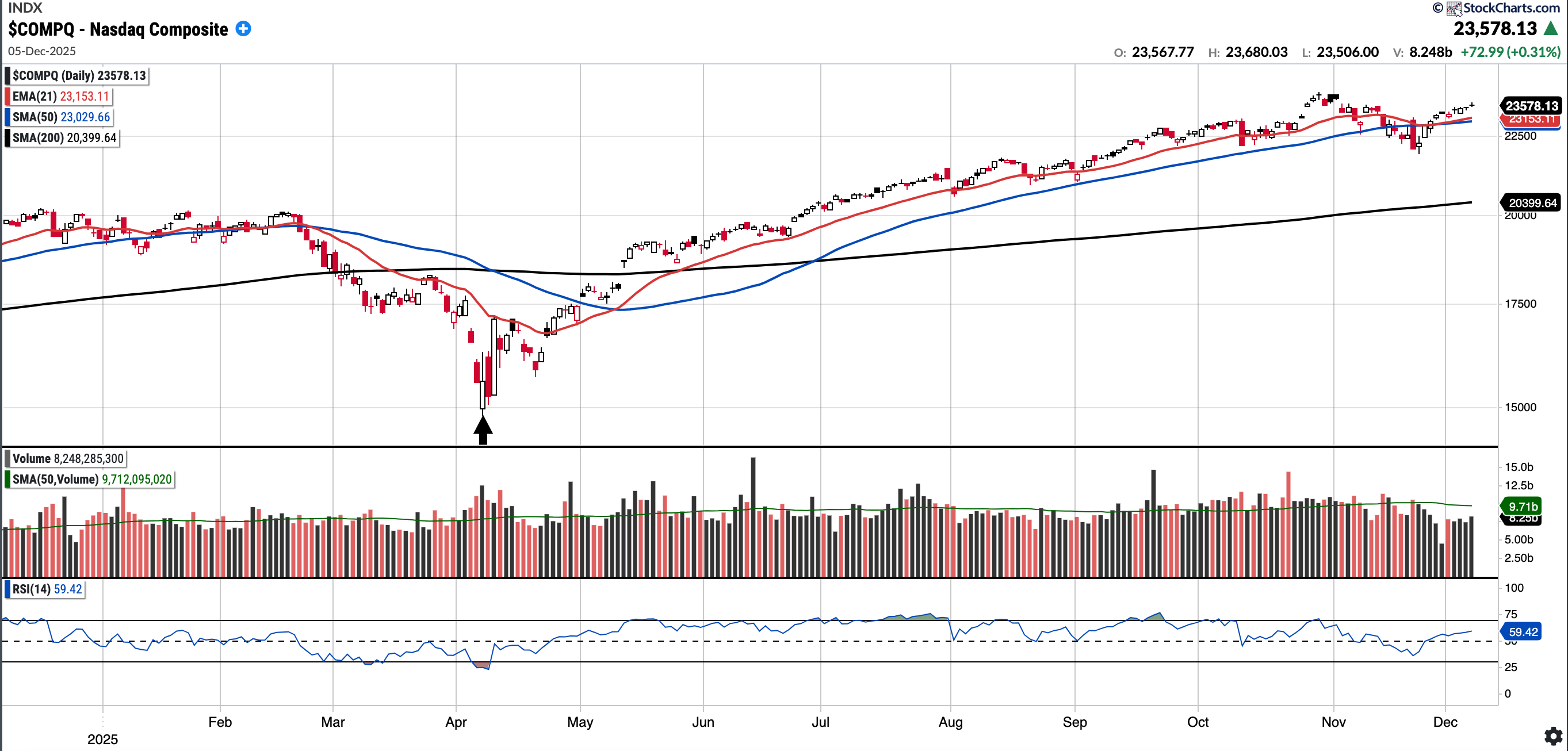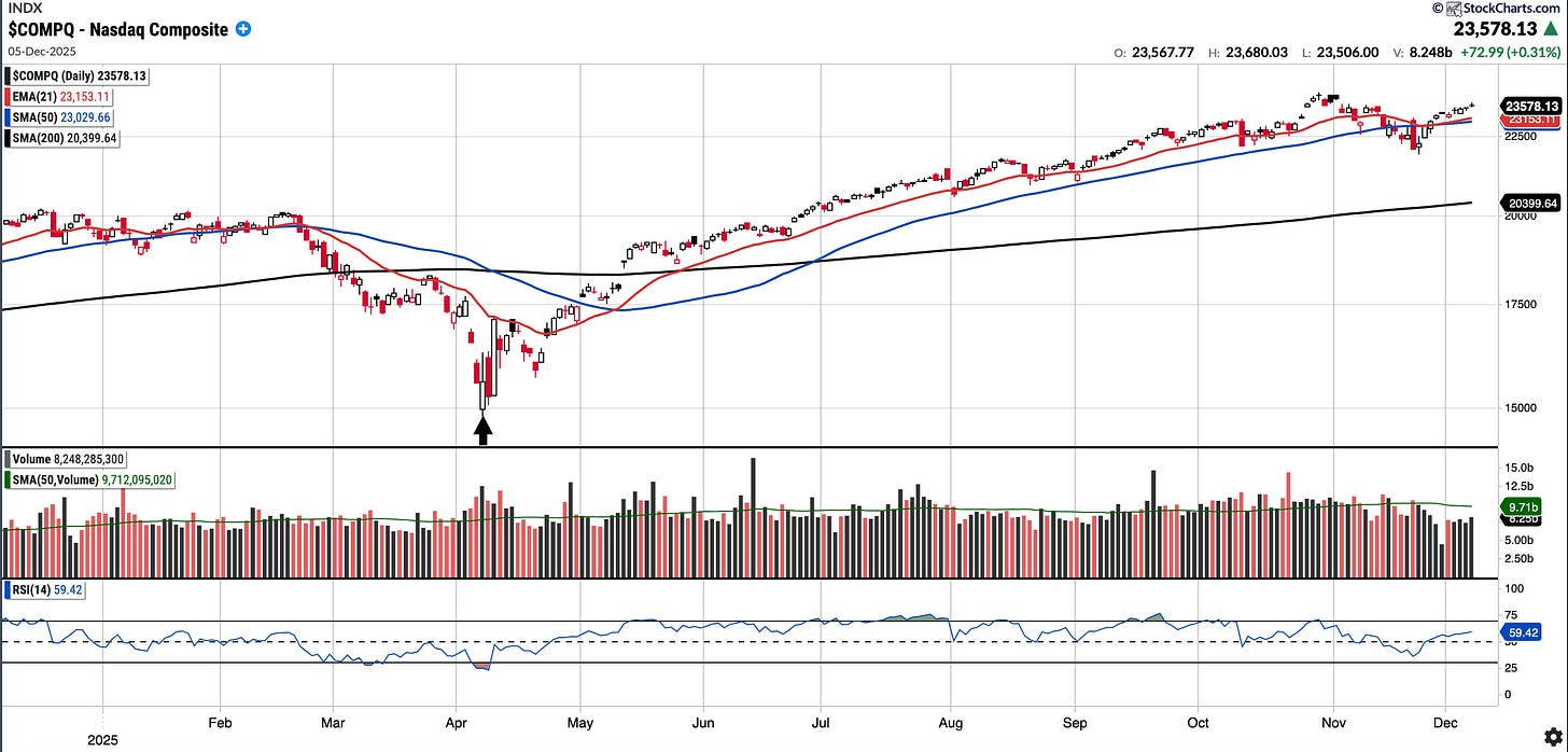 Like the S&P 500, the Nasdaq Composite was green 4 days in a row to end the week. It remains above both the EMA 21 and the SMA 50.