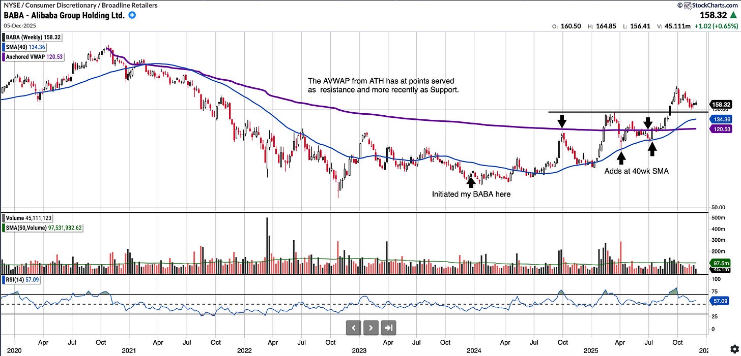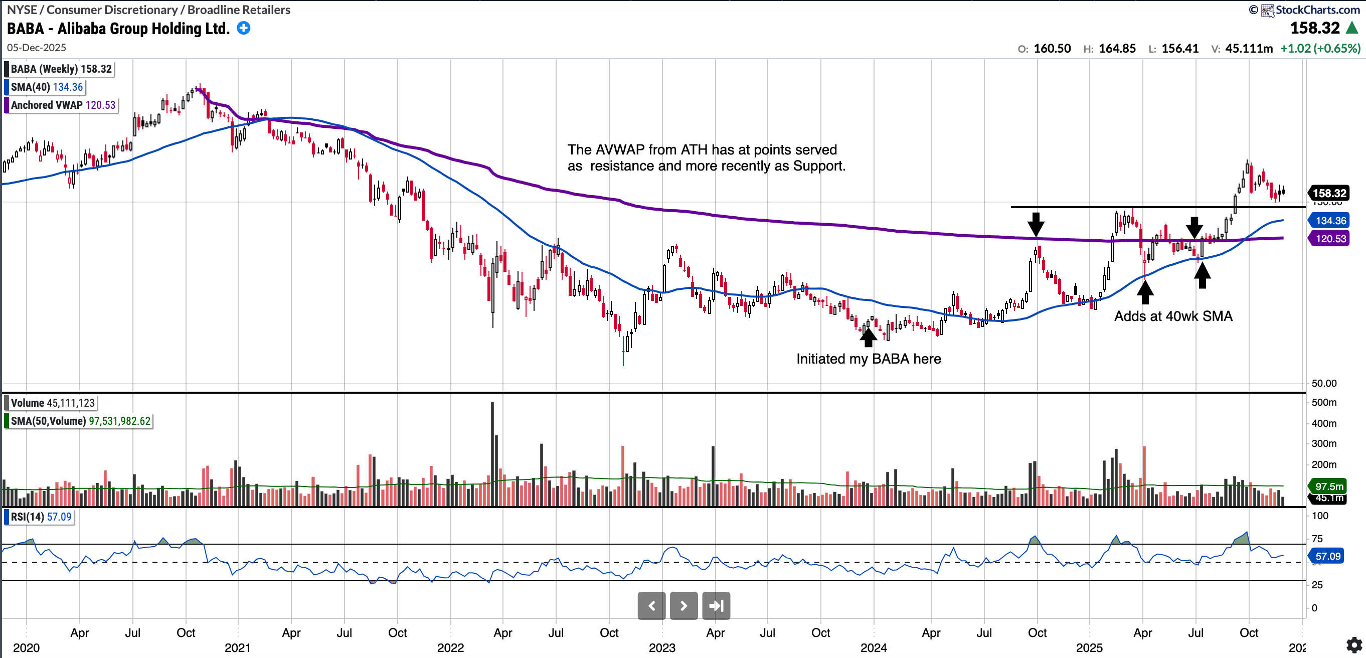 BABA reported earnings last week and since then seems to be basing in the low 150’s. I will be looking to see if it can hold the $145 support level, below that the SMA 200 and the AVWAP from ATH which has more more recently served as support. The AVWAP sits at 120.53