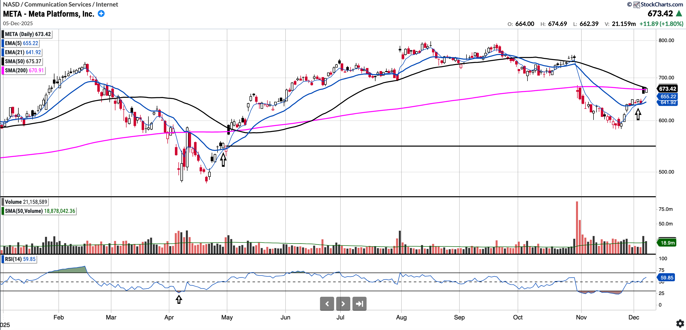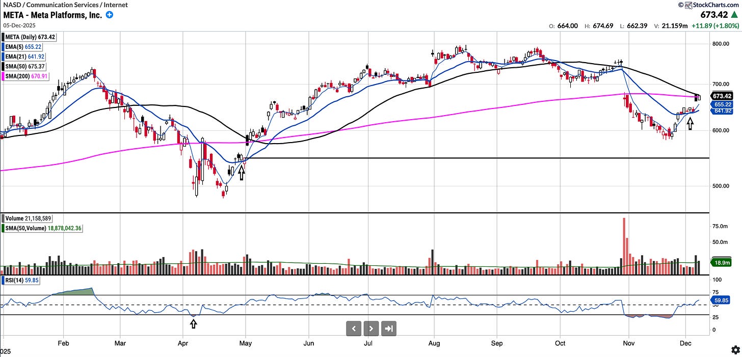 META needs to reclaim the SMA 200 and then a logical upside target is the gap fill to $743. Note the 5EMA has ticked above the EMA 21 which is constructive.
