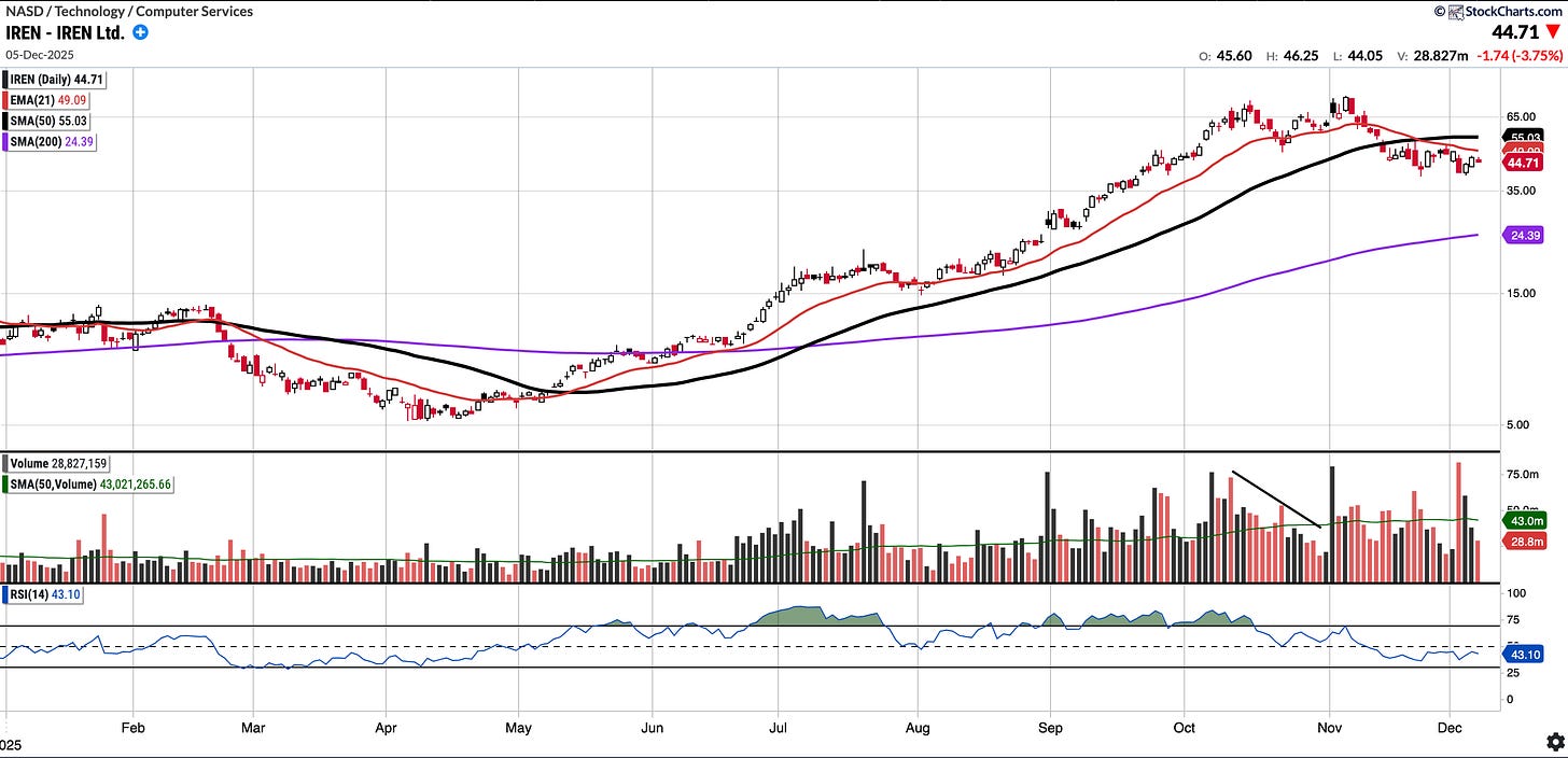 IREN bulls would like it to reclaim the EMA 21 and the SMA 50 with conviction before can feel good about a resumed uptrend. I would say Bears remain firmly in charge, for now.
