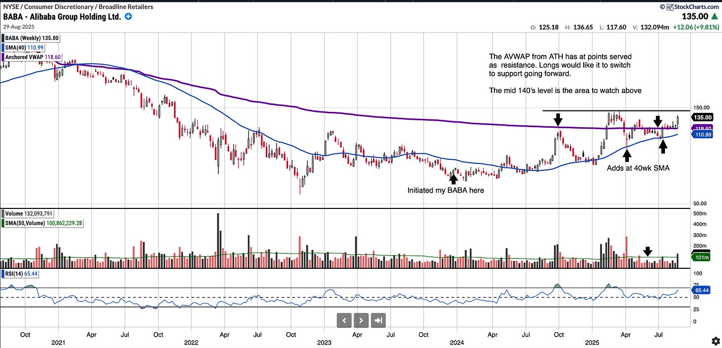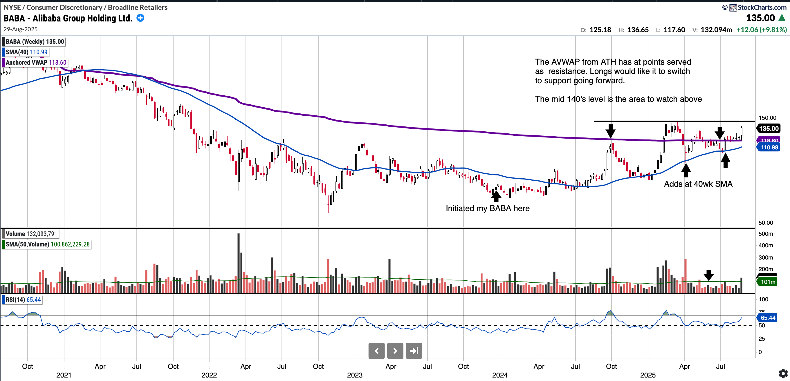 BABA had a decent run earlier in the year but found this year but found resistance in the mid 140 level where I previously reduced some of the position BABA trim March 17th 2025