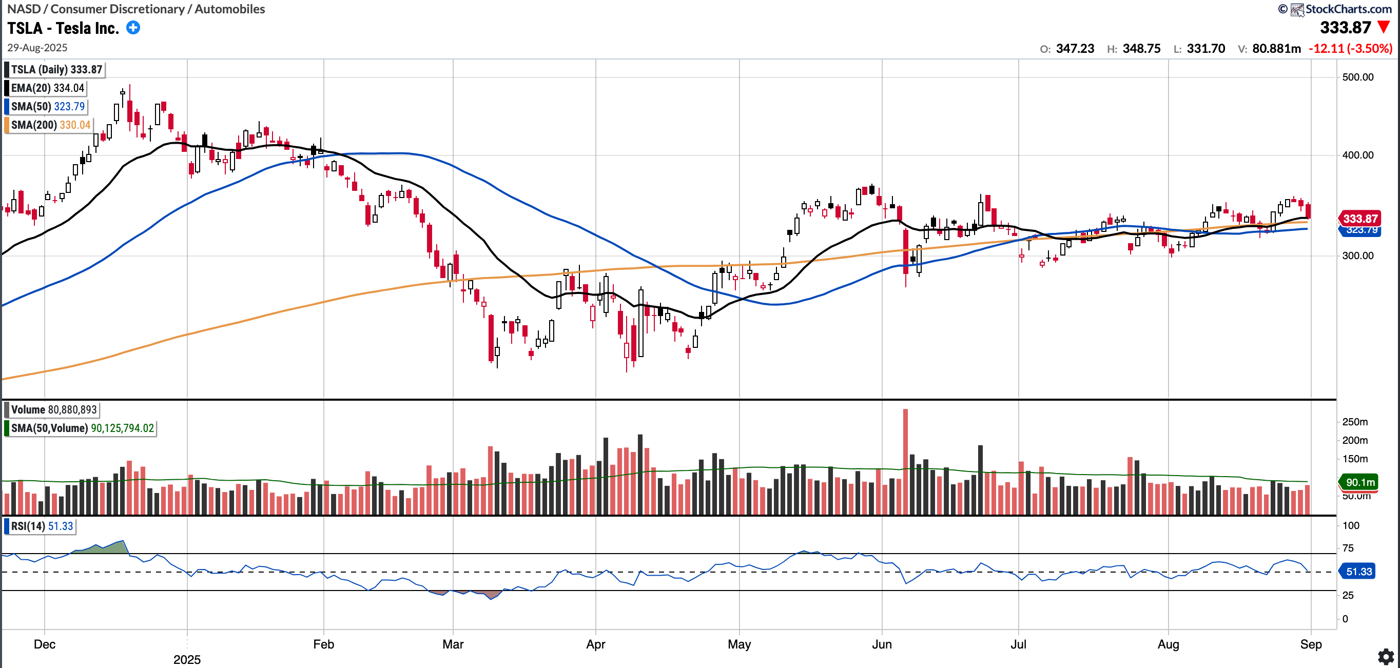 TSLA key moving averages are coming to a confluence at ~330 and the stock has shrugged off a lot of bad news in recent weeks, such as poor earnings reports, poor delivery numbers, the unimpressive launch of its Robotaxi, and, last but not least, Elon's misgivings with the sitting U.S. president. That is notable.
