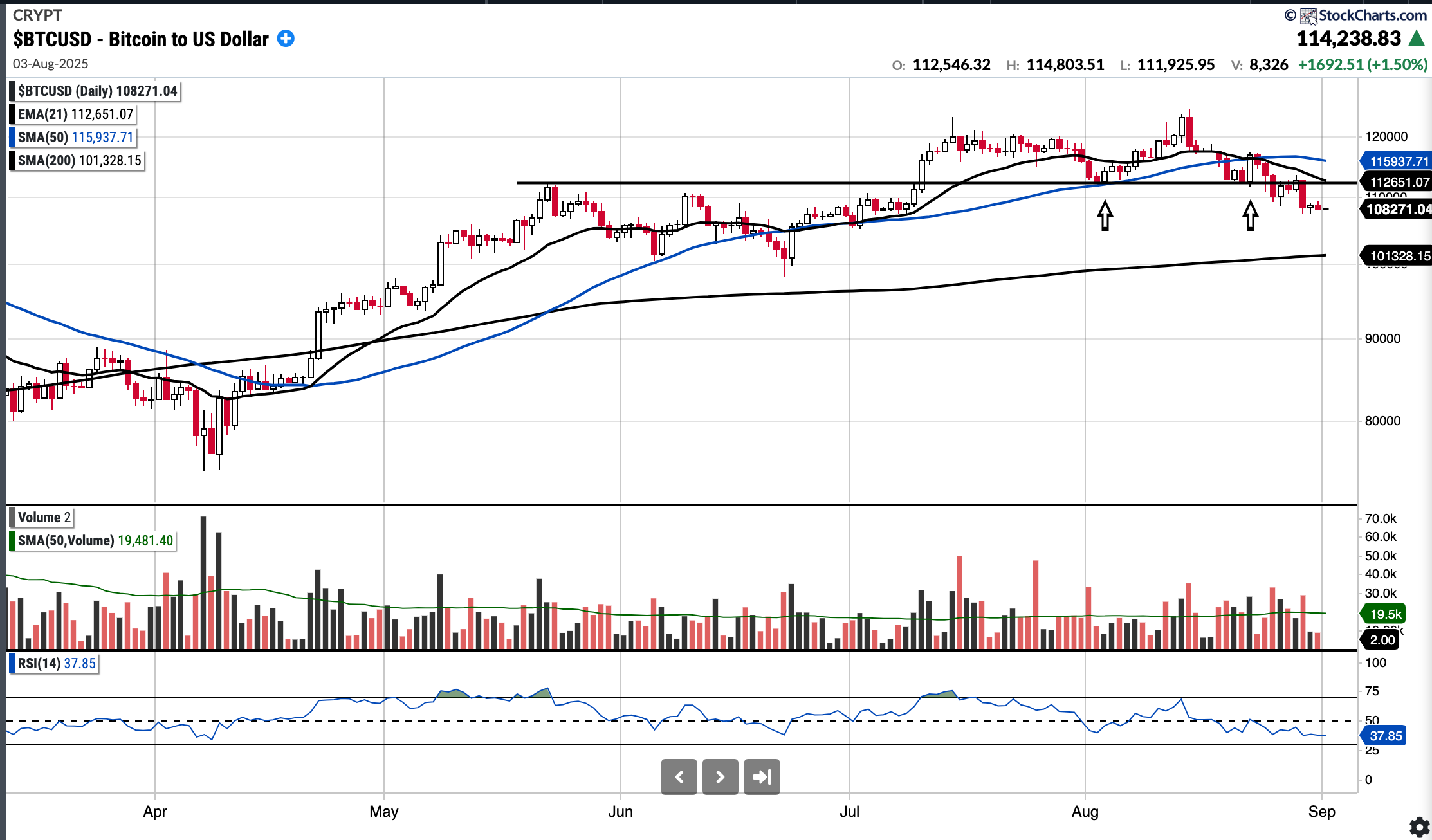 Currently $108,271.01, -6.61% below 50 SMA and 6.85% above 200SMA.