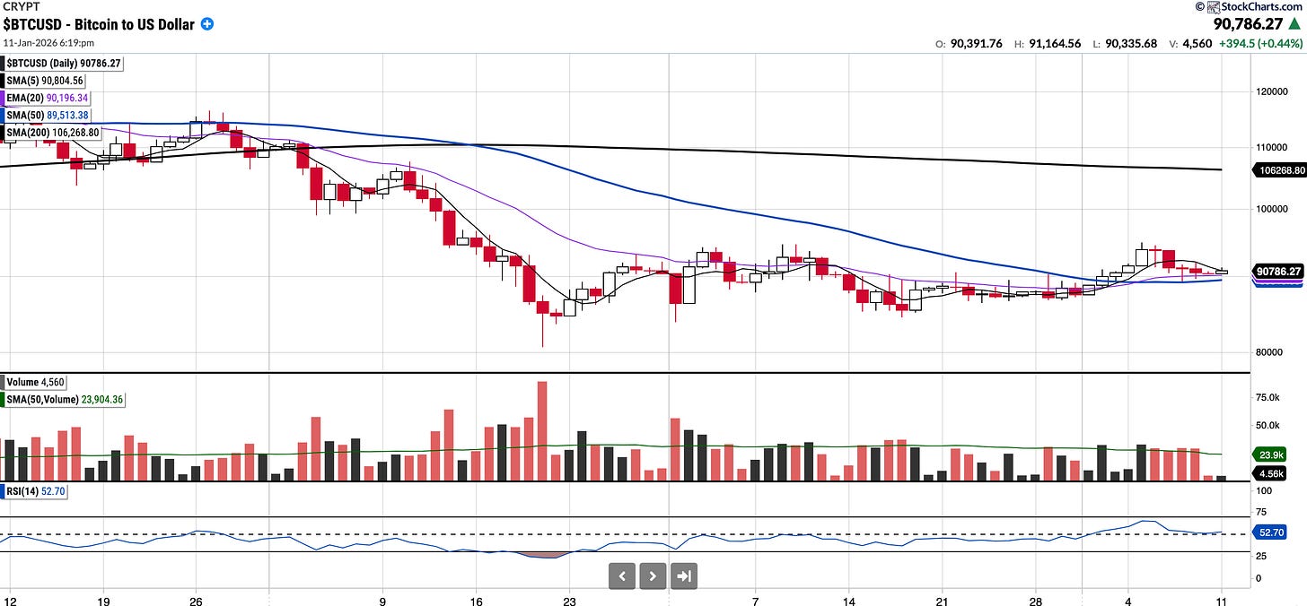 Currently trades at $90,786.27, 1.42% above the 50SMA and 14.57% below the 200SMA.