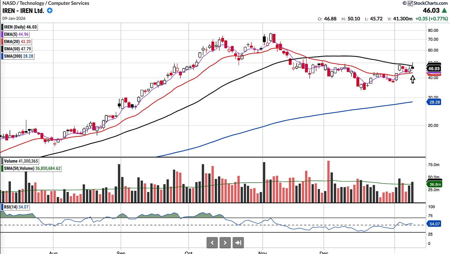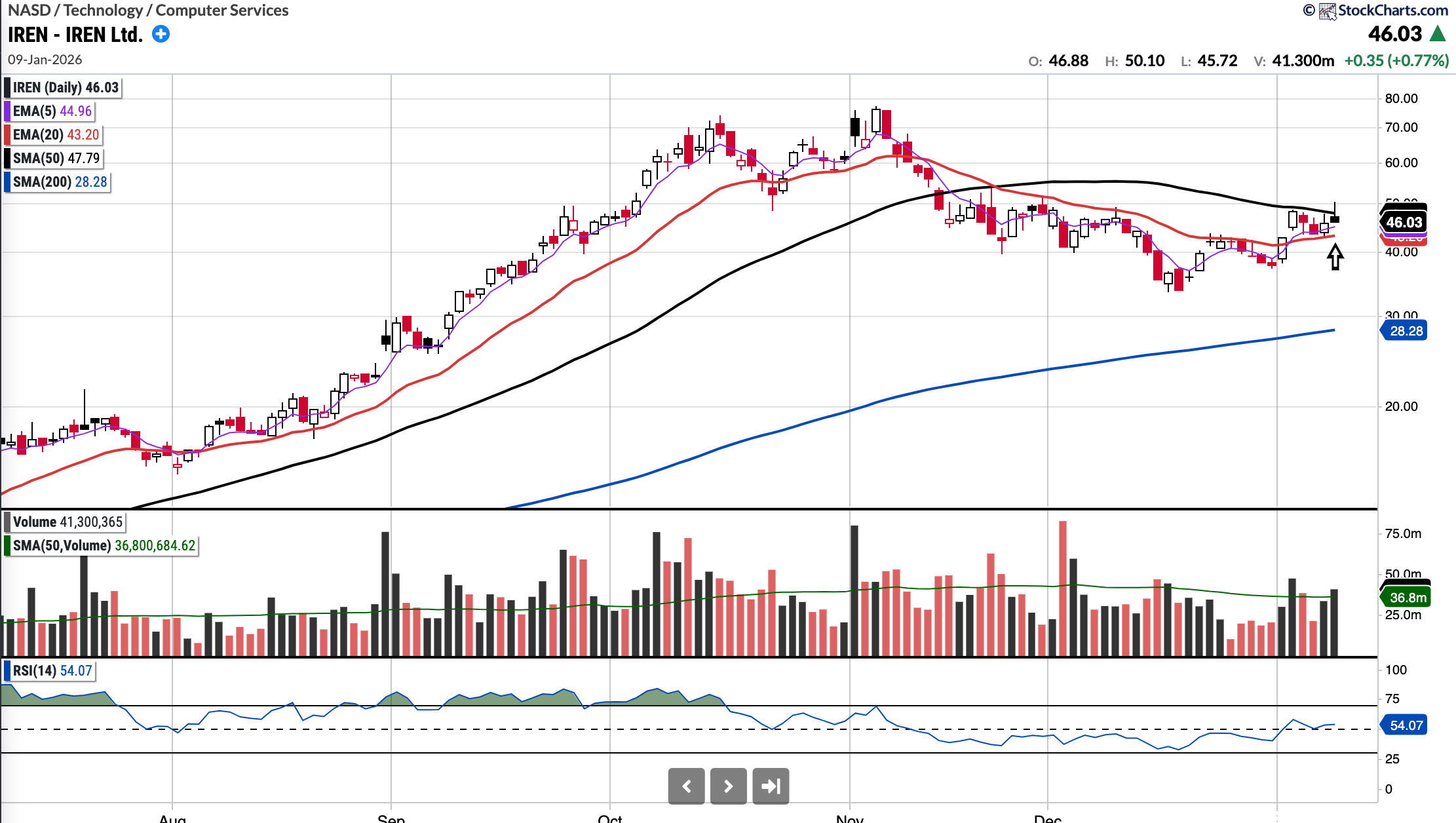 IREN remains in an uptrend on a longer time frame although remains below the descending overhead SMA 50.