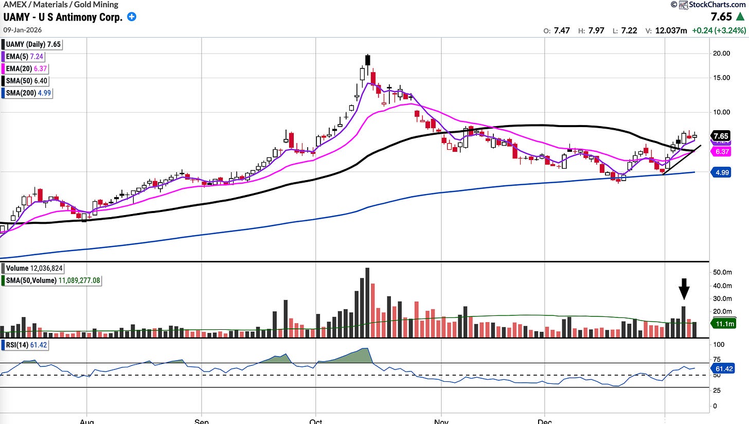 UAMY stock is up 30% or so since I featured this stock last Sunday. The chart is starting to really set-up now with all nearer-term moving averages crossing over the longer term ones. Good volume is entering. For a new entry, one may have to wait for an EMA 20 re-test or to grab on the EMA 5 pullback.