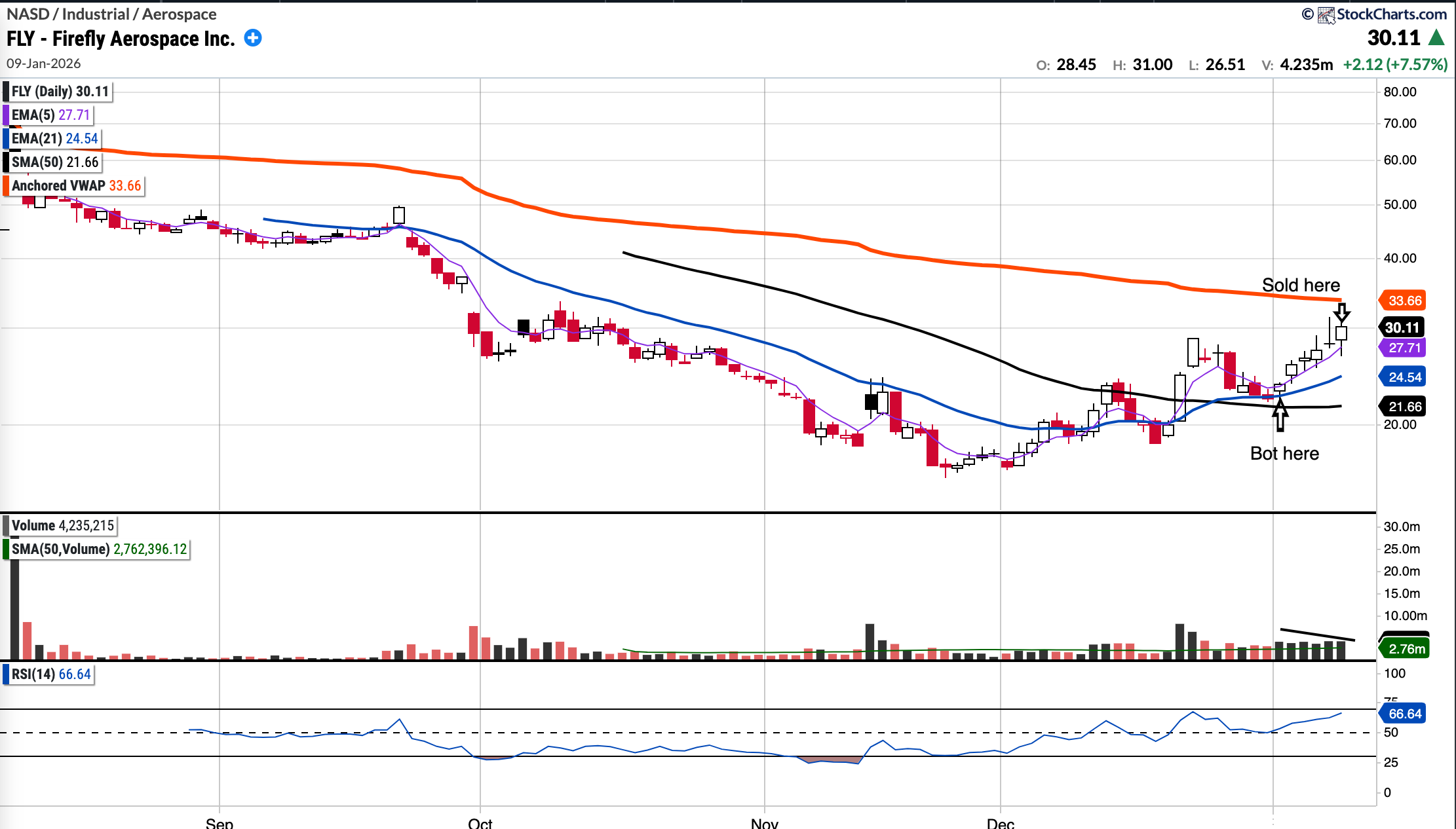 Firefly Aerospace ($FLY) is speculative aerospace play with a high ADR. I had good success trading it this last week for +36% in 6 sessions.