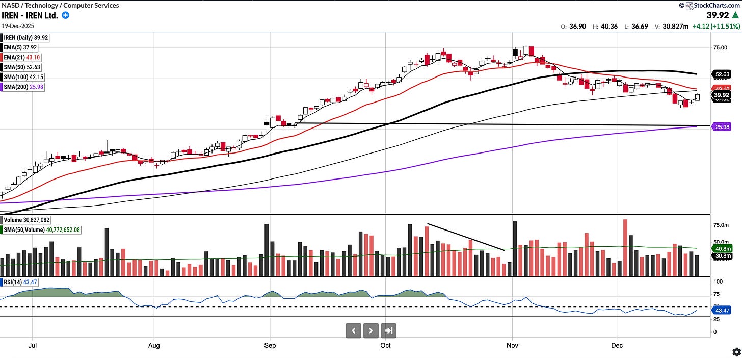 The IREN chart remains in an uptrend on a longer time frame but has lost key moving averages, most recently the 100SMA. IREN fell as low as $33 this week but has now rebounded to above $39, a level bulls would like it to hold as previously has served as support. A tradable set-up is forming I believe.