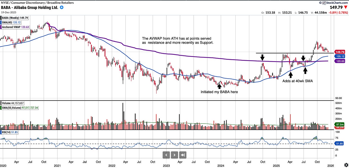 Whilst down on the week, BABA stock still appears to be consolidating above the 145 breakout level. I will be looking to see if it can hold the $145 support level, below that the SMA 200 and the AVWAP from ATH which has more more recently served as support. The AVWAP sits at 120.63.