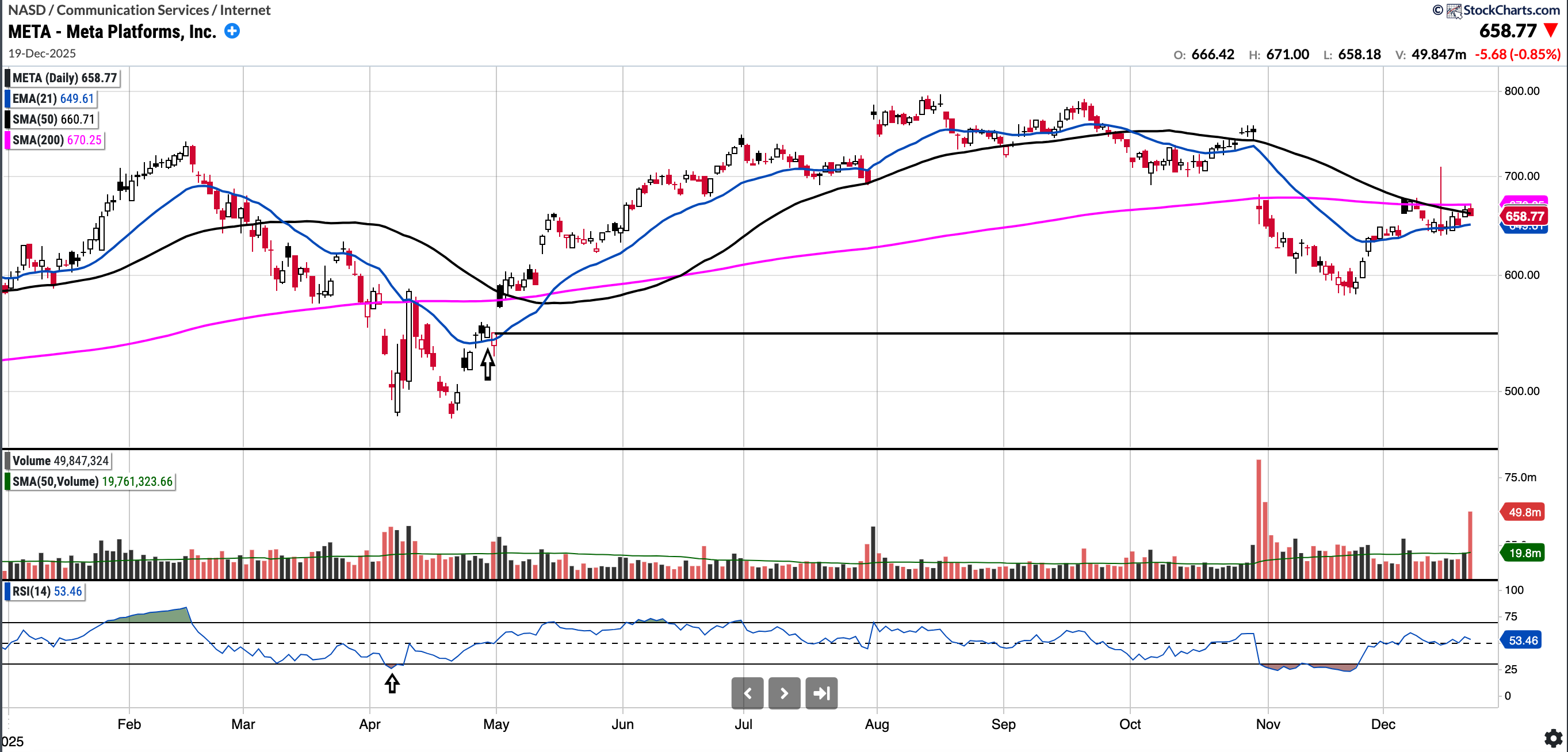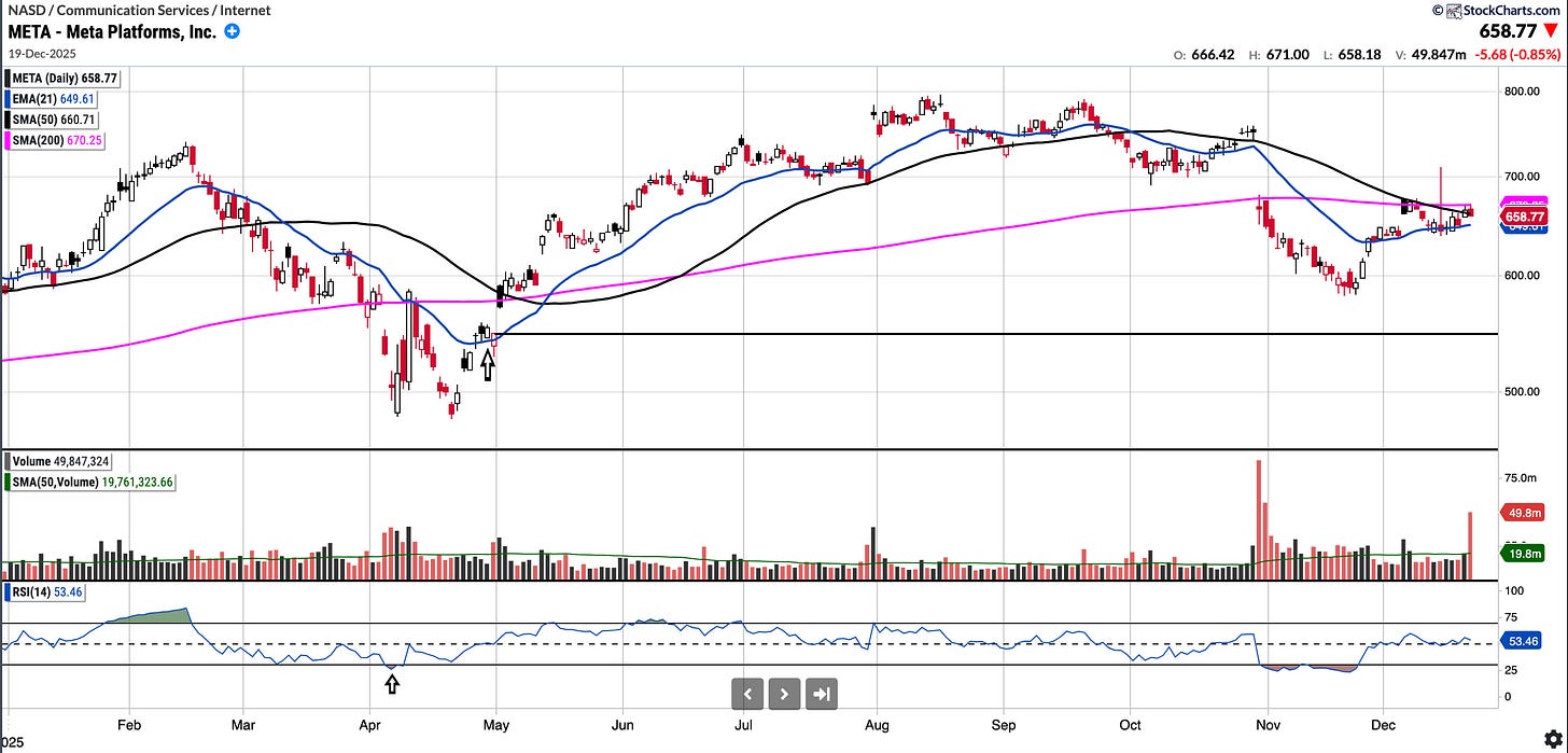 For the chart to look more constructive, META needs to reclaim the SMA 200 (where it has been finding resistance) and then a logical upside target is the gap fill to $743. Note the 5EMA has recently ticked above the EMA 21 which is a constructive initial sign. This week the stock was rejected twice at the SMA 200, bulls would like to see this cleanly reclaimed.