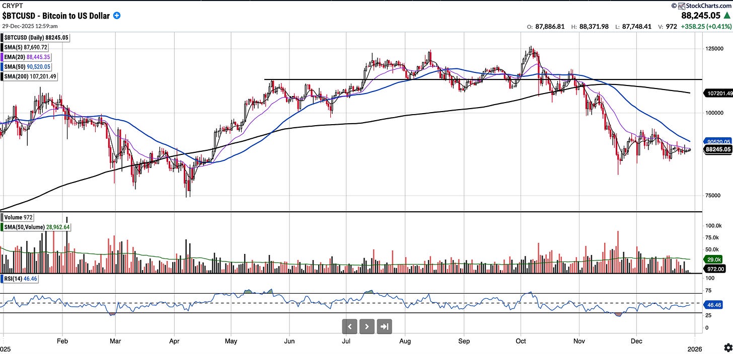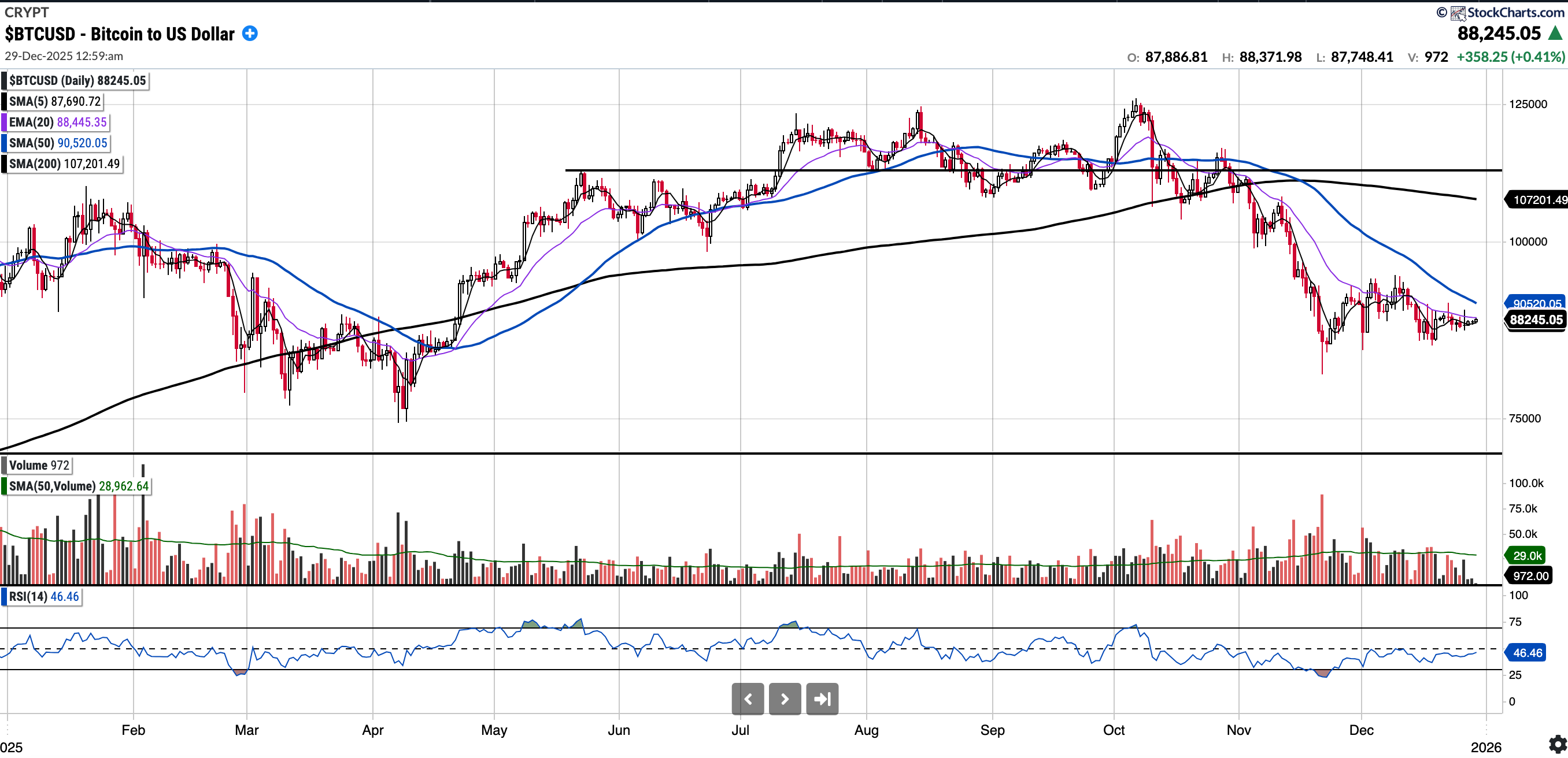 Currently trades at $88,245.05, ~2.4% below the 50SMA and 17.50% below the 200SMA.