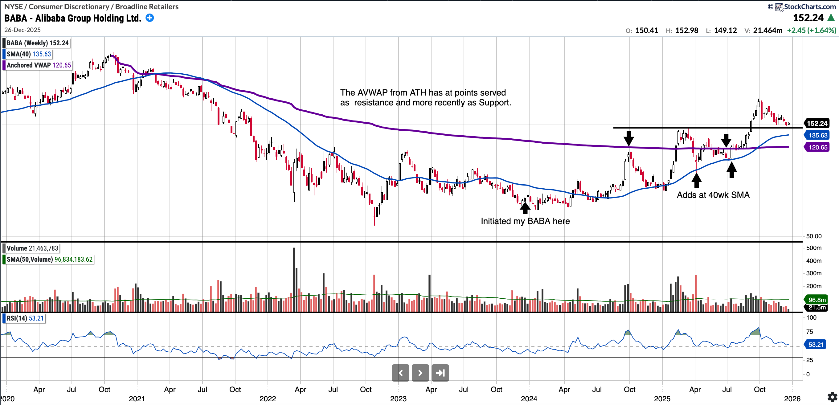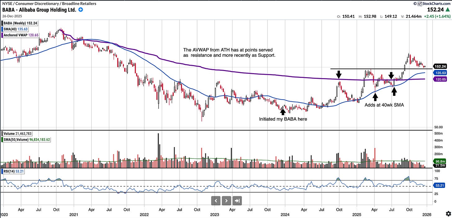 I continue to feature BABA because I like the way BABA stock is consolidating with price compression above the 145 breakout level. I will be looking to see if it can hold the $145 support level, below that the SMA 200 and the AVWAP from ATH which has more more recently served as support. The AVWAP sits at 120.65. I am looking to slowly accumulate more.