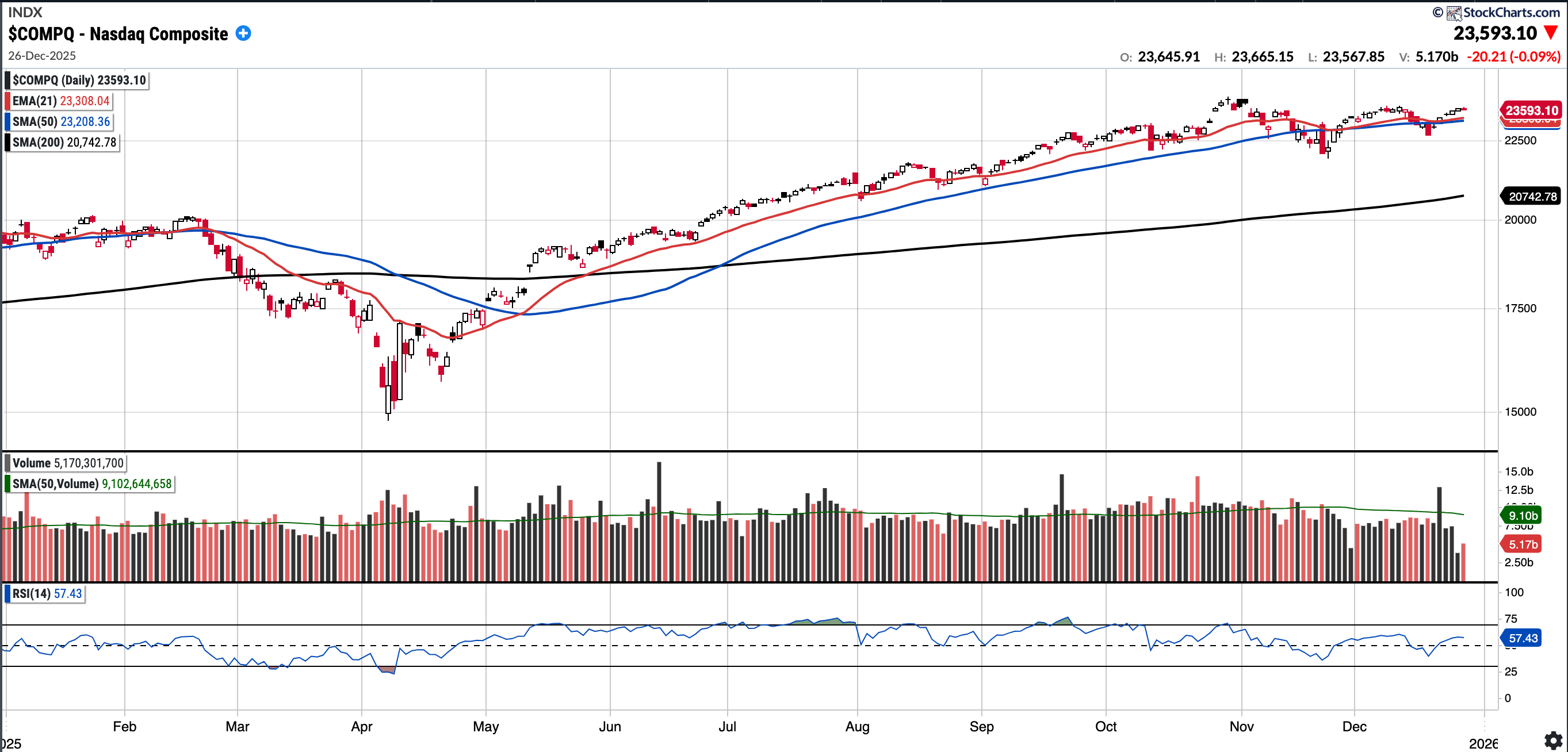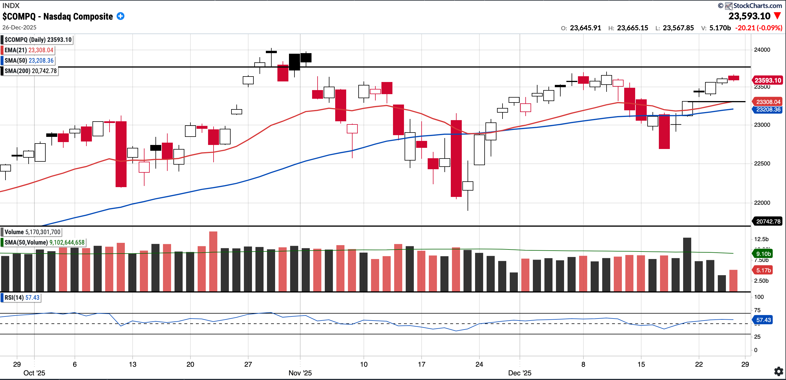 Currently trades at 23,593.1, 1.66% above a rising 50SMA and 13.74% above 200SMA.