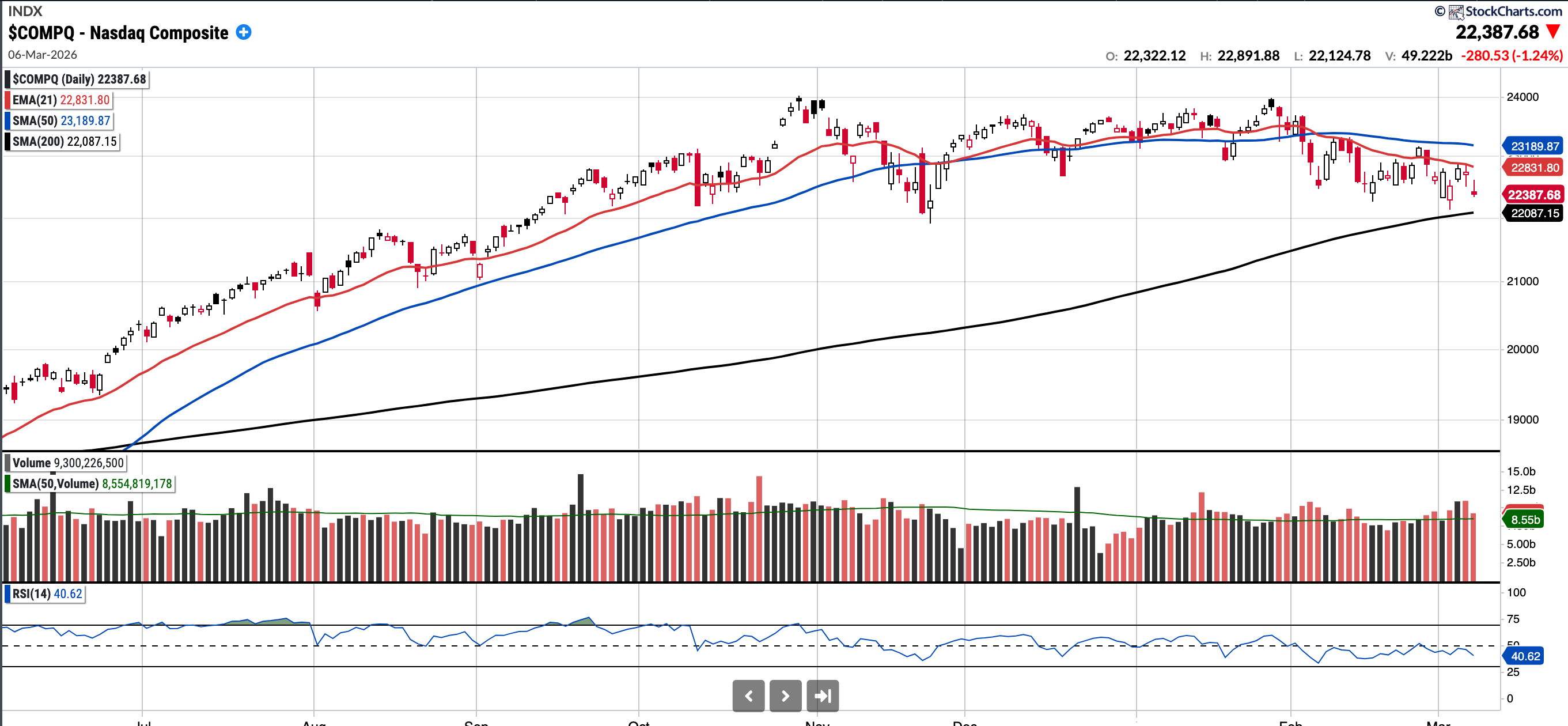 The Nasdaq Composite had a volatile week, with 3 distribution days and remains below both the 21EMA and 50SMA. Not constructive in the slightest and downturn probability remains quite high. The SMA 200 is also within touching distance below.