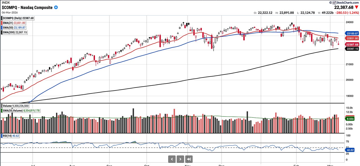 Currently trades at 22,387.68, 3.46% below a declining 50SMA and 1.36% below the 200SMA.